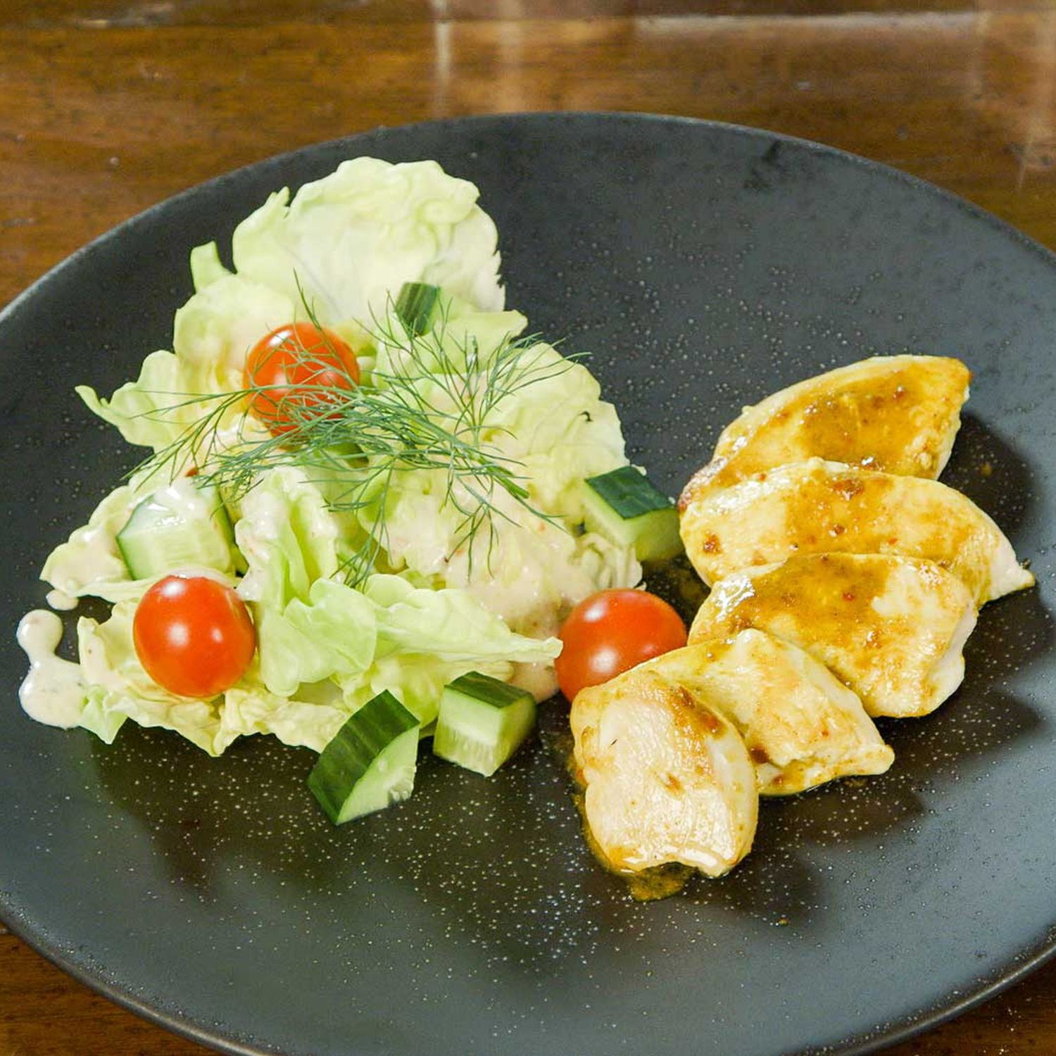 Salat, Cocktailtomaten und Gurken in einer Salatschüssel mit dem Dressing marinieren, auf Tellern anrichten und die Hähnchenscheiben anlegen. Mit Dillzweigen garnieren.