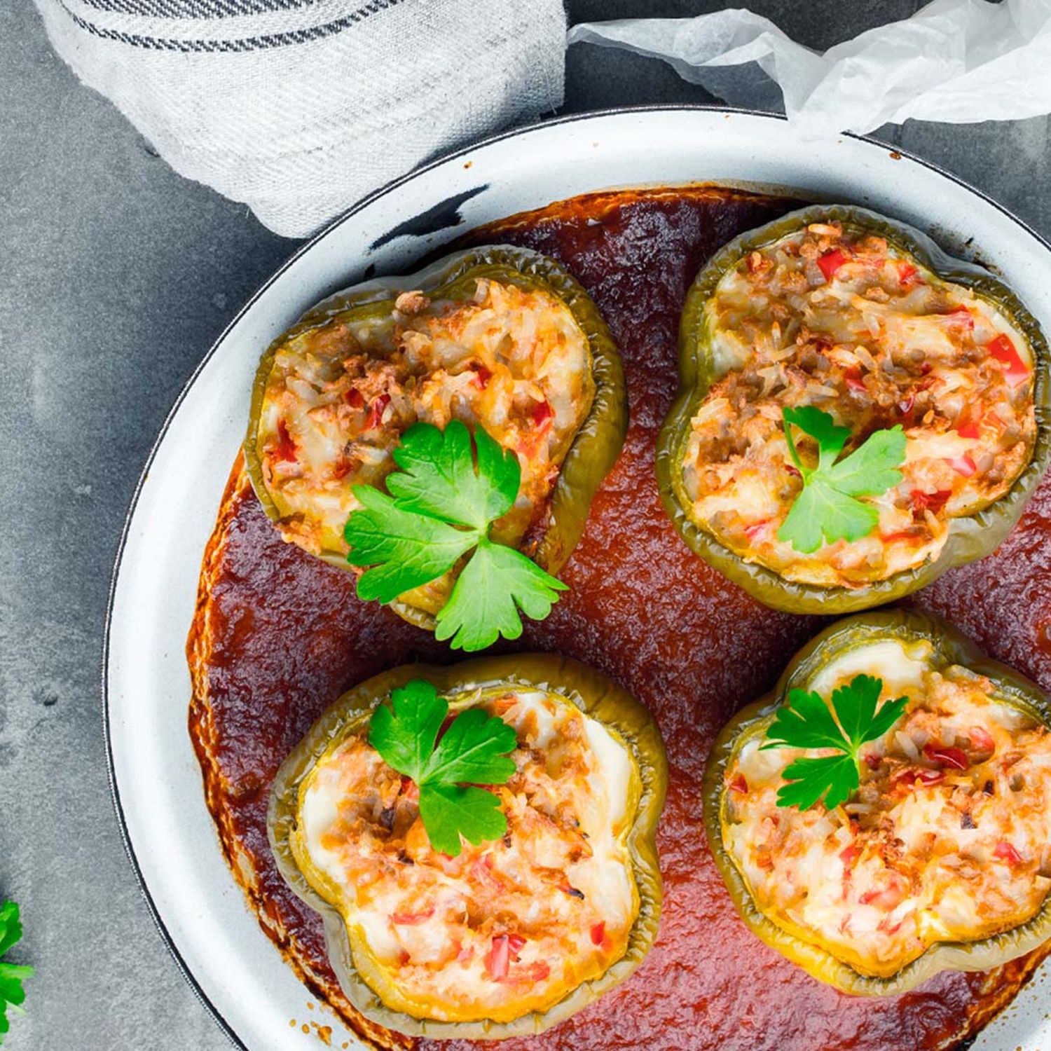 Tomatensauce über die Paprika gießen. Bei 145 °C Heißluft für ca. 50–60 Minuten backen.
