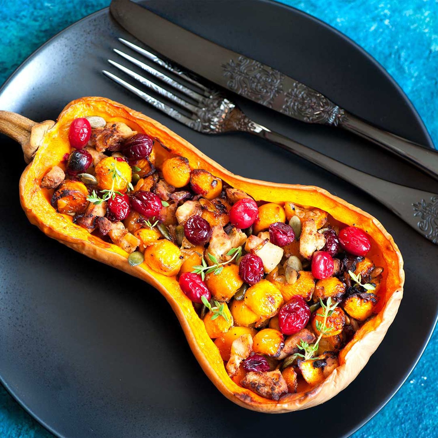 8. Die Füllung abschmecken und in die Kürbishälften füllen. Die Hälften zusammenlegen, mit einer Schnur zusammenknoten und noch einmal bei 180 °C für 10 Minuten backen.