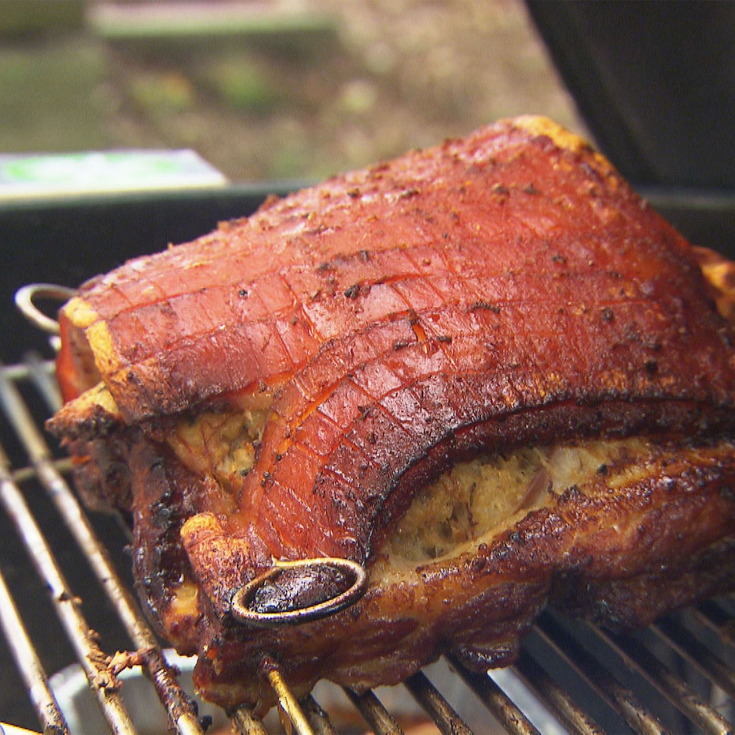 Den Kugelgrill auf 180 °C vorheizen und den Schweinebauch etwa zweieinhalb Stunden indirekt grillen. Als Faustregel gilt: Pro Kilogramm Fleisch eine Stunde auf dem Grill einplanen.