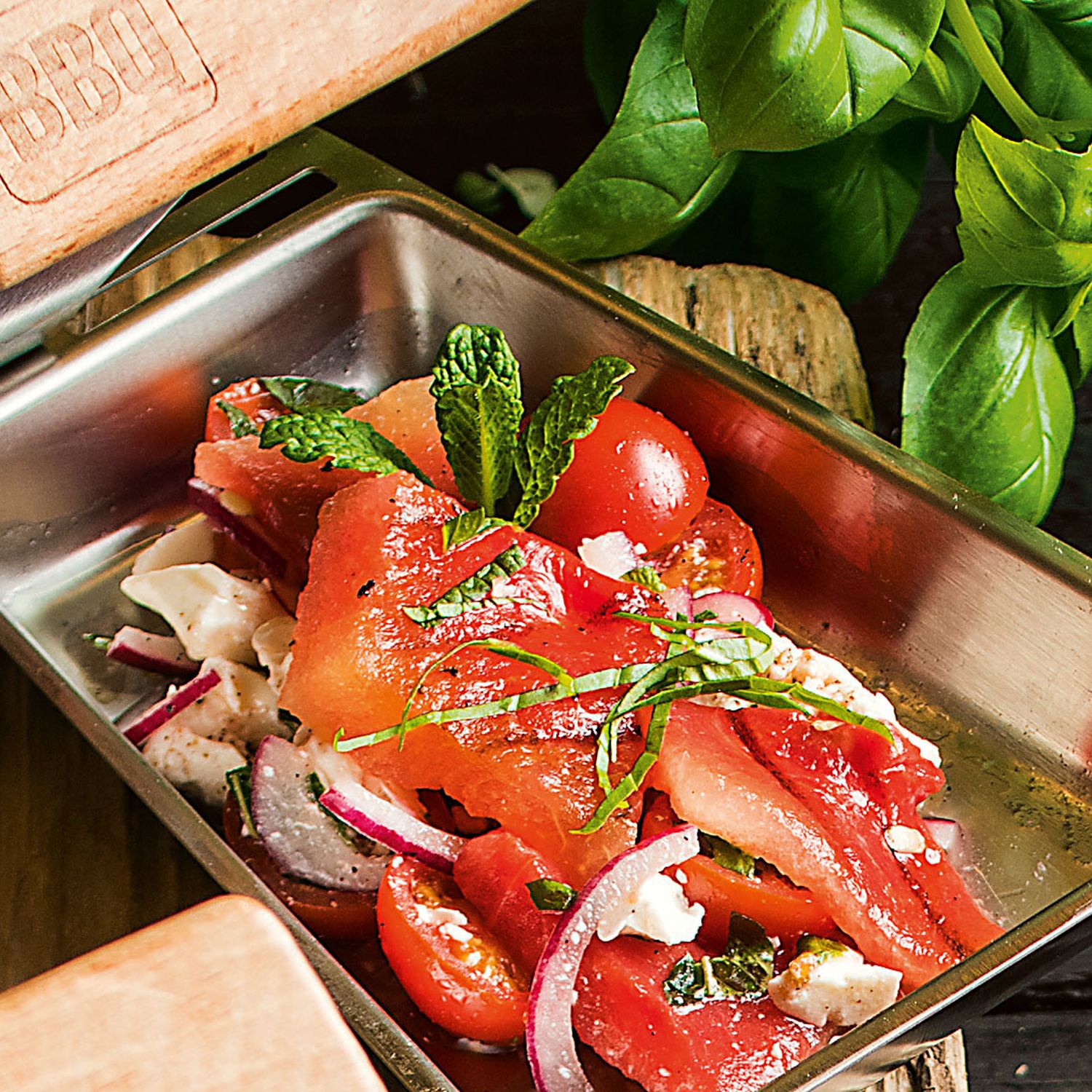 Gegrillte Wassermelone in Minze-Tomatensalat mit Feta