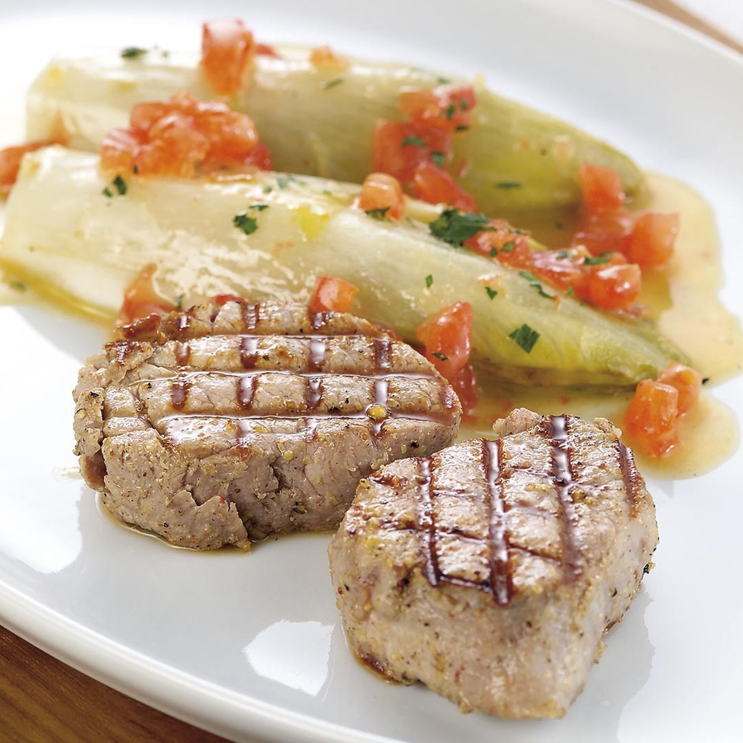 Ist der Chicorée fertig gegart, können die marinierten Steaks auf den Grill gelegt werden. Inzwischen die Tomate blanchieren, die Haut abziehen und in Würfel schneiden. Den geschmorten Chicorée aus der Form heben, den Strunk entfernen und den Schmorfond passieren. Diesen Fond aufkochen, die kalte Butter einschlagen, mit Salz, Pfeffer und Petersilie würzen und die Tomatenwürfel beigeben. Kurz warm machen (nicht mehr aufkochen) und über das Gemüse geben.