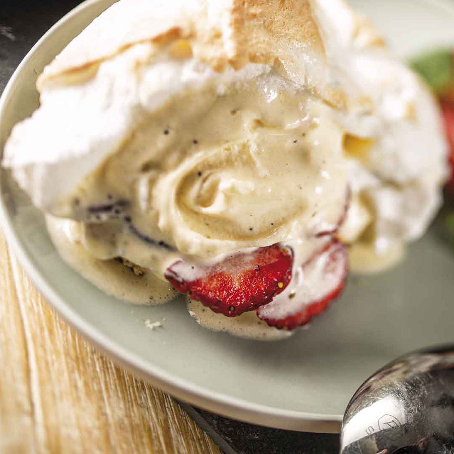 Die Biskuitböden in eine Alutasse legen und mit Erdbeerscheiben belegen. Eiklar mit Staubzucker zu einem sehr steifen Schnee schlagen, danach Eiskugeln auf die Erdbeeren setzen und schnell mit Eischnee ummanteln. Sofort bei 220 °C zugedeckt grillen (bis der Eischnee leicht braun ist) und anschließend servieren.