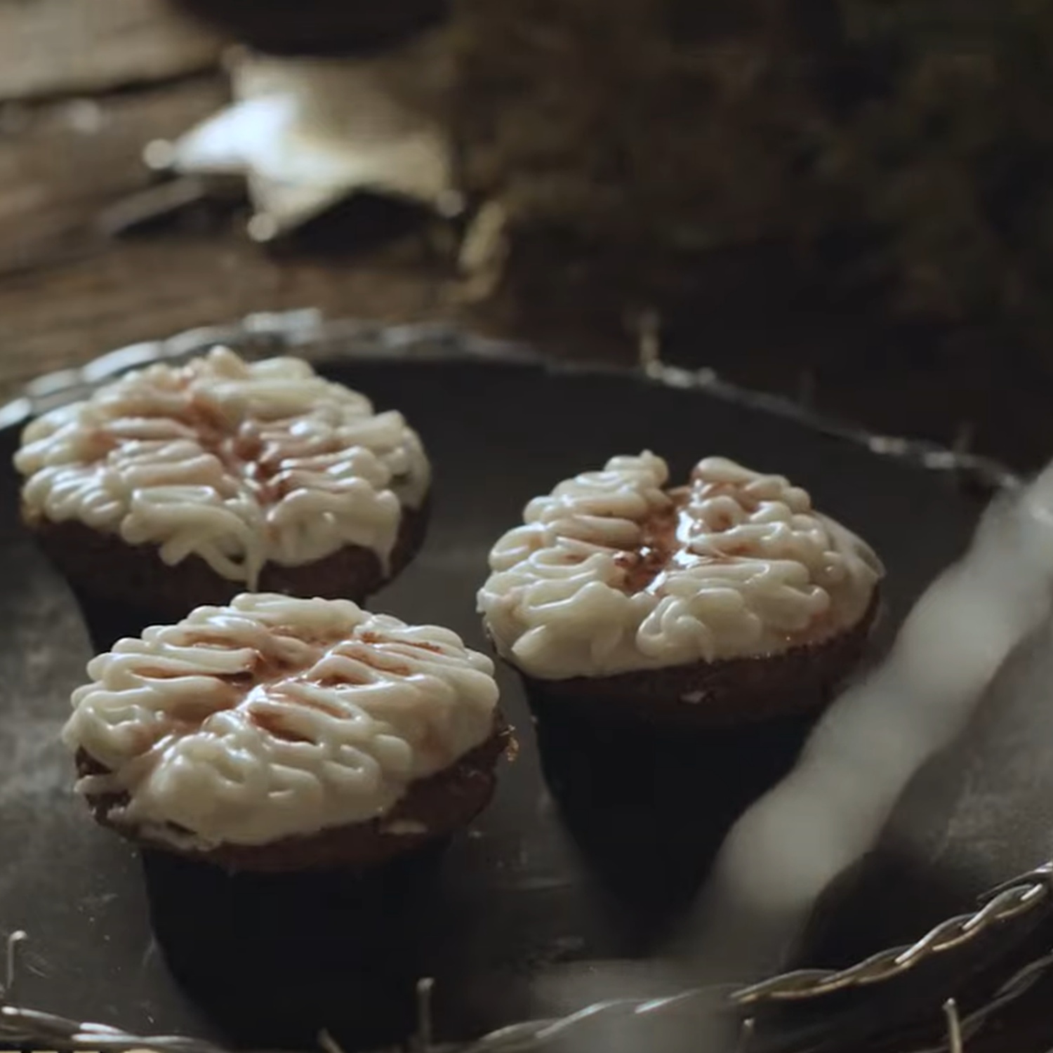 Mit einem Spritzbeutel ein Gehirnmuster auf die Muffins zeichnen. Muffins dann kaltstellen.
