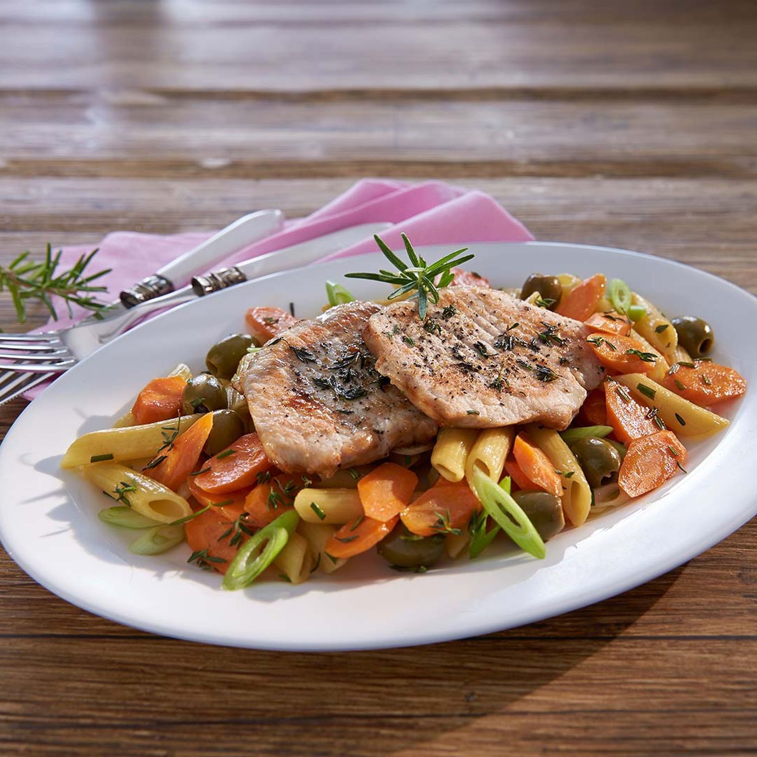Aus der Pfanne nehmen und im Backofen warm stellen. Das restliche Öl in dieselbe Pfanne geben und im Bratrückstand die Karotten und Jungzwiebeln etwa 5–6 Minuten anschwitzen. Knoblauch, Suppe, Obers, Oliven und Thymian zufügen und 4–5 Minuten reduzieren lassen.