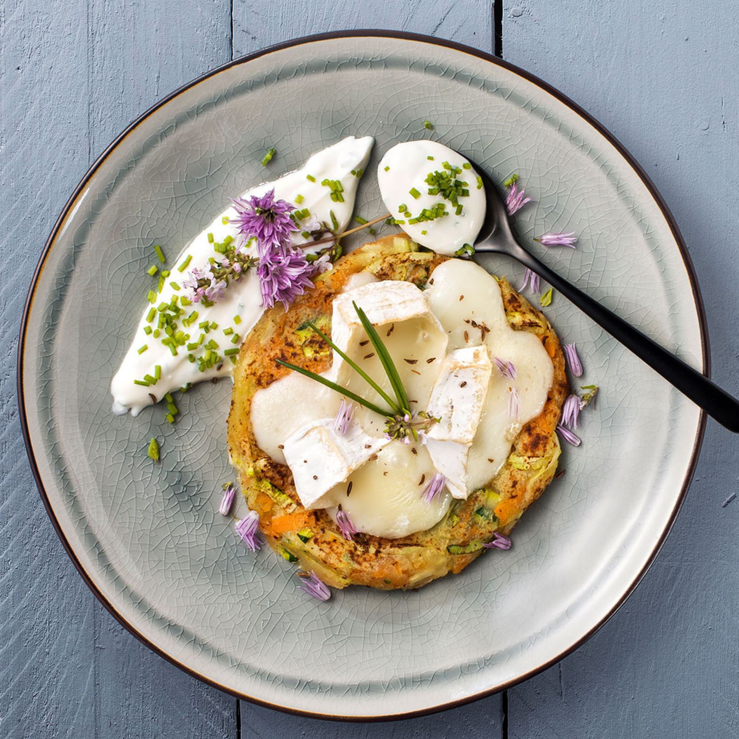 Gemüse Kartoffelrösti mit gratiniertem Schafcamembert und Schnittlauchdip