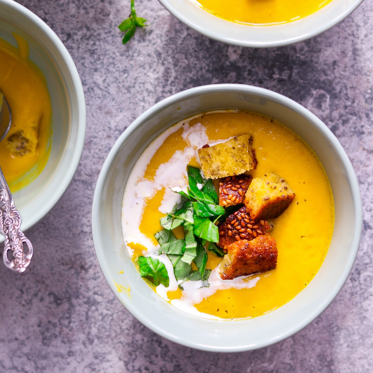 Das Gemüse in einem Mixer pürieren, mit Gemüsebrühe aufgießen und mit Salz abschmecken.
