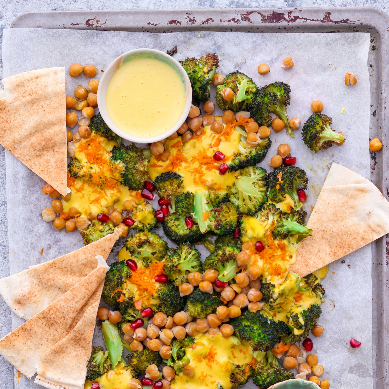Inzwischen die Kichererbsen waschen und abtropfen lassen. In einer kleinen Schüssel mit Olivenöl und gemahlenem Koriander marinieren und mit dem Brokkoli auf das Backblech geben.