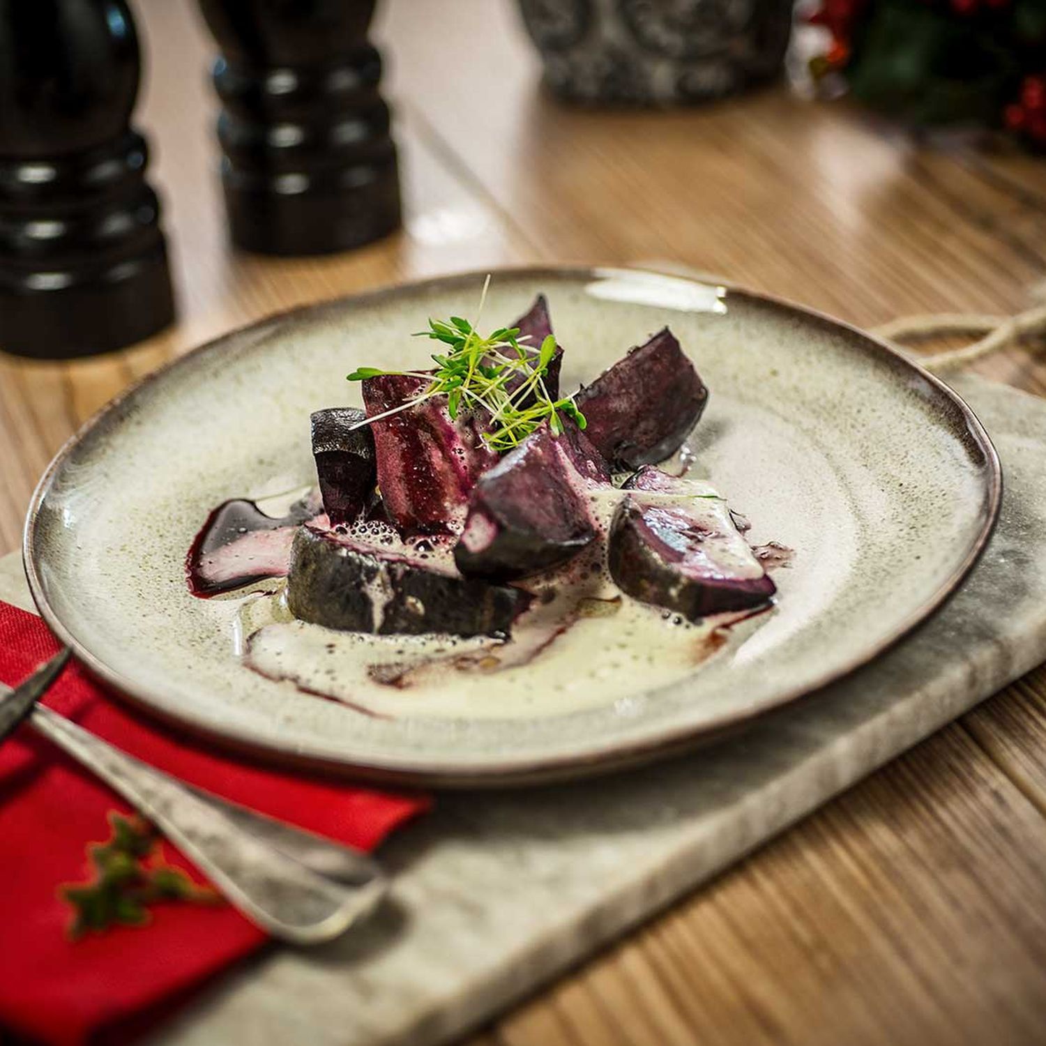 Geschmorte Rote Rübe mit warmem Kresseschaum