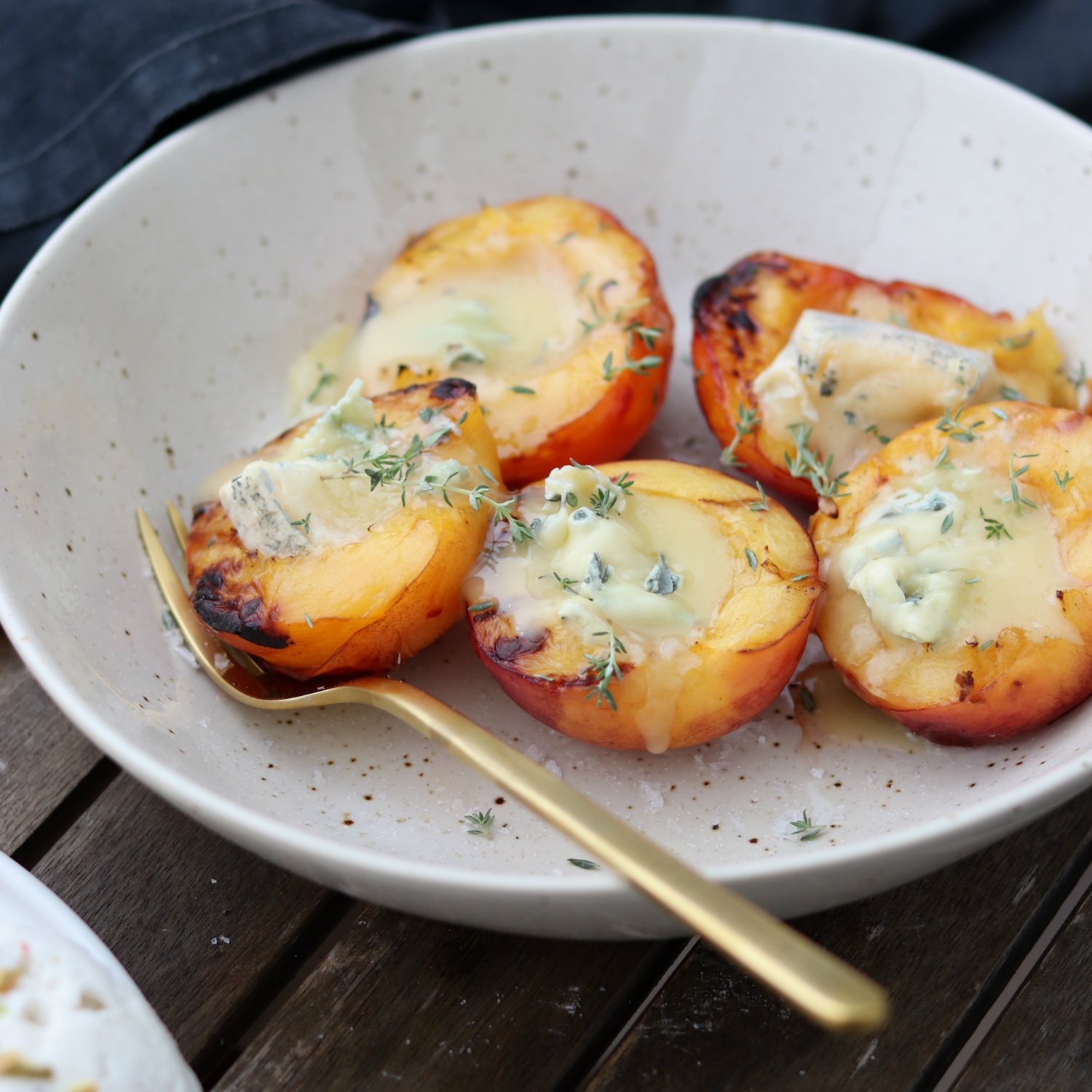 2. Die fertig angebratenen Nektarinen auf die Teller geben, mit Gorgonzola garnieren und mit frischem Thymian und Meersalz abschmecken.