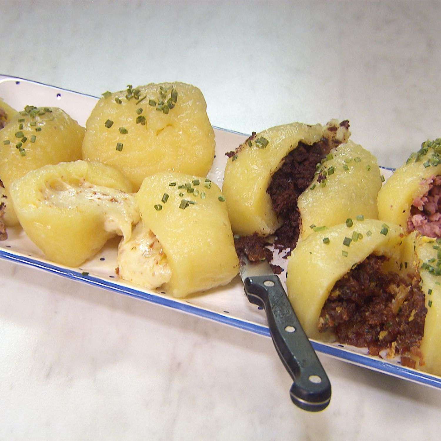 Die Erdäpfel kochen, schälen und durch die Erdäpfelpresse drücken. Das Stärkemehl und eine Prise Salz beimengen und zu einem geschmeidigen Teig kneten.