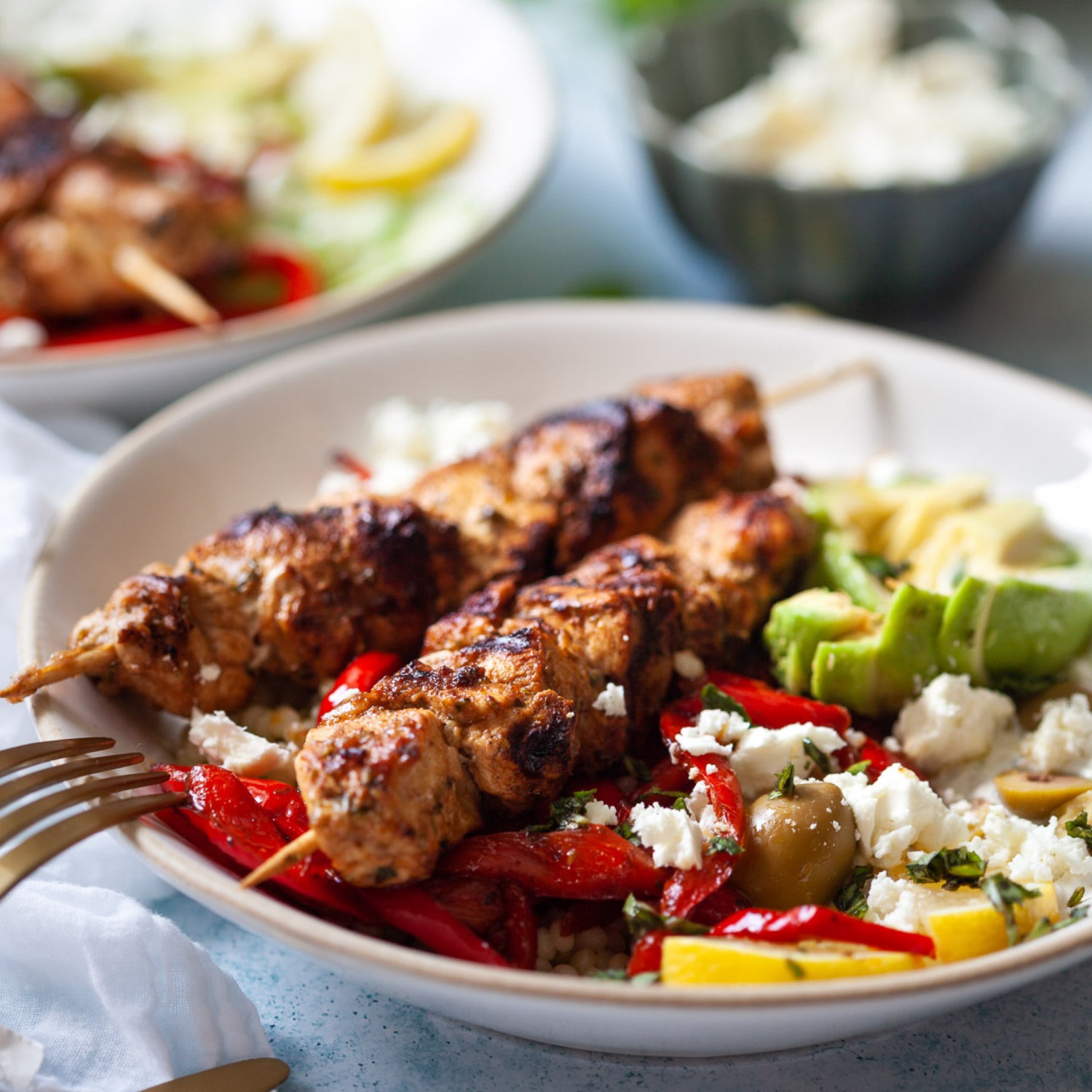 Fleisch in mundgerechte Stücke schneiden und in einer große Schüssel geben. Olivenöl, Balsalmicoessig, Paprika, Organo, gehackte Zwiebel, gehackter Knoblauch, Zitronensaft und -zesten sowie Salz und Pfeffer mit dem Hühnerfleisch vermengen und für mindestens 15 Minuten marinieren lassen.
