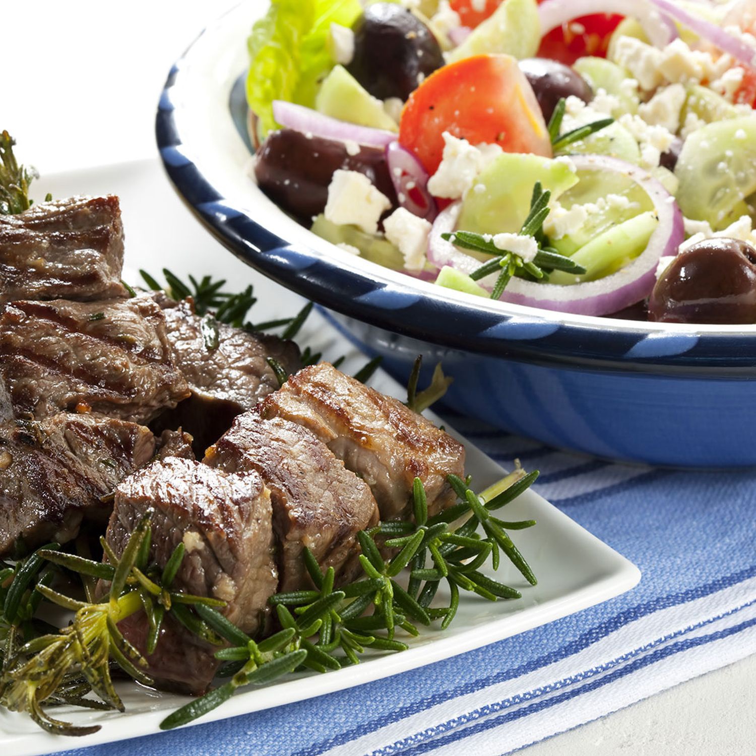 Ein leckeres und leichtes Gericht für heiße Sommertage! Bereiten Sie für sich und Ihre Gäste den leckeren griechischen Salat mit gebratenen Lammwürfeln zu. Lasst es euch schmecken!