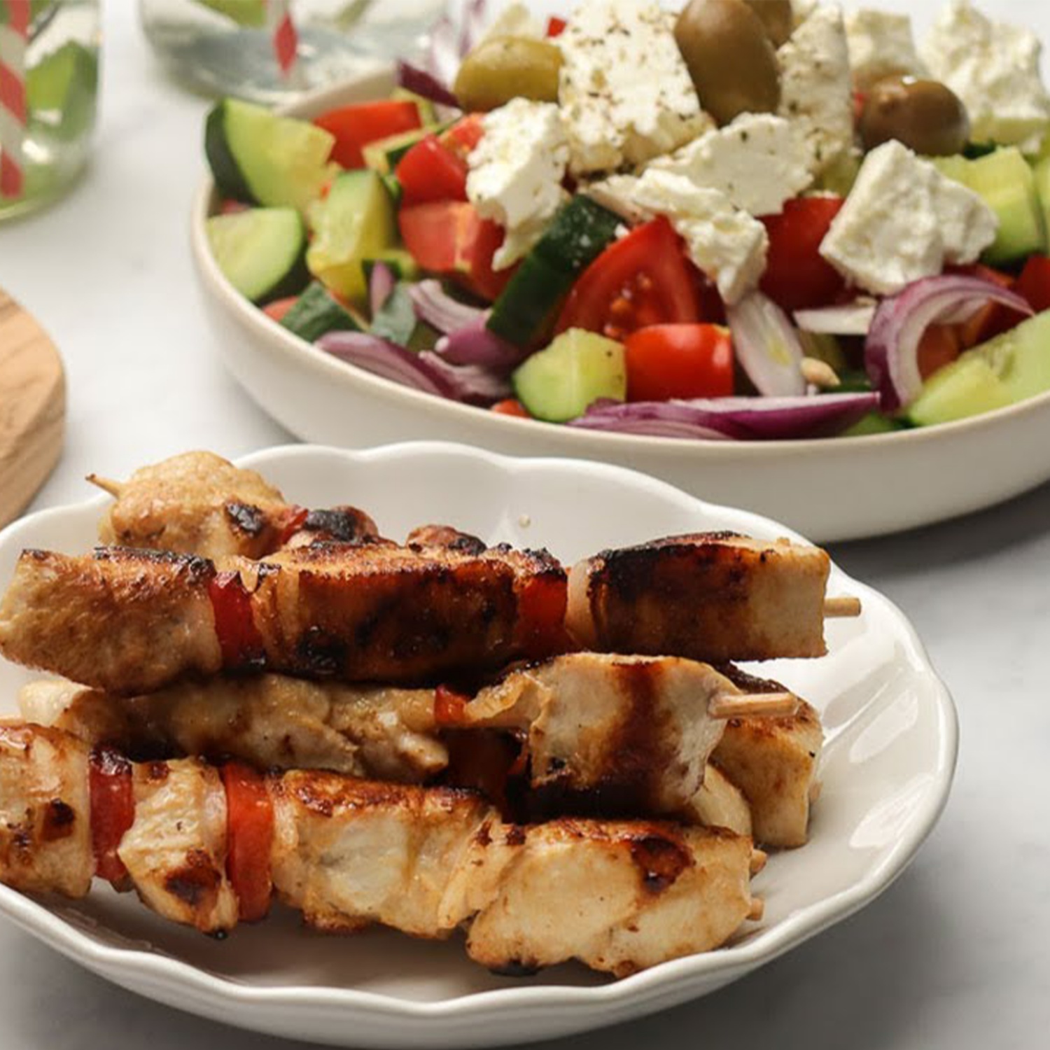 Griechischer Salat mit Hühnerspießen