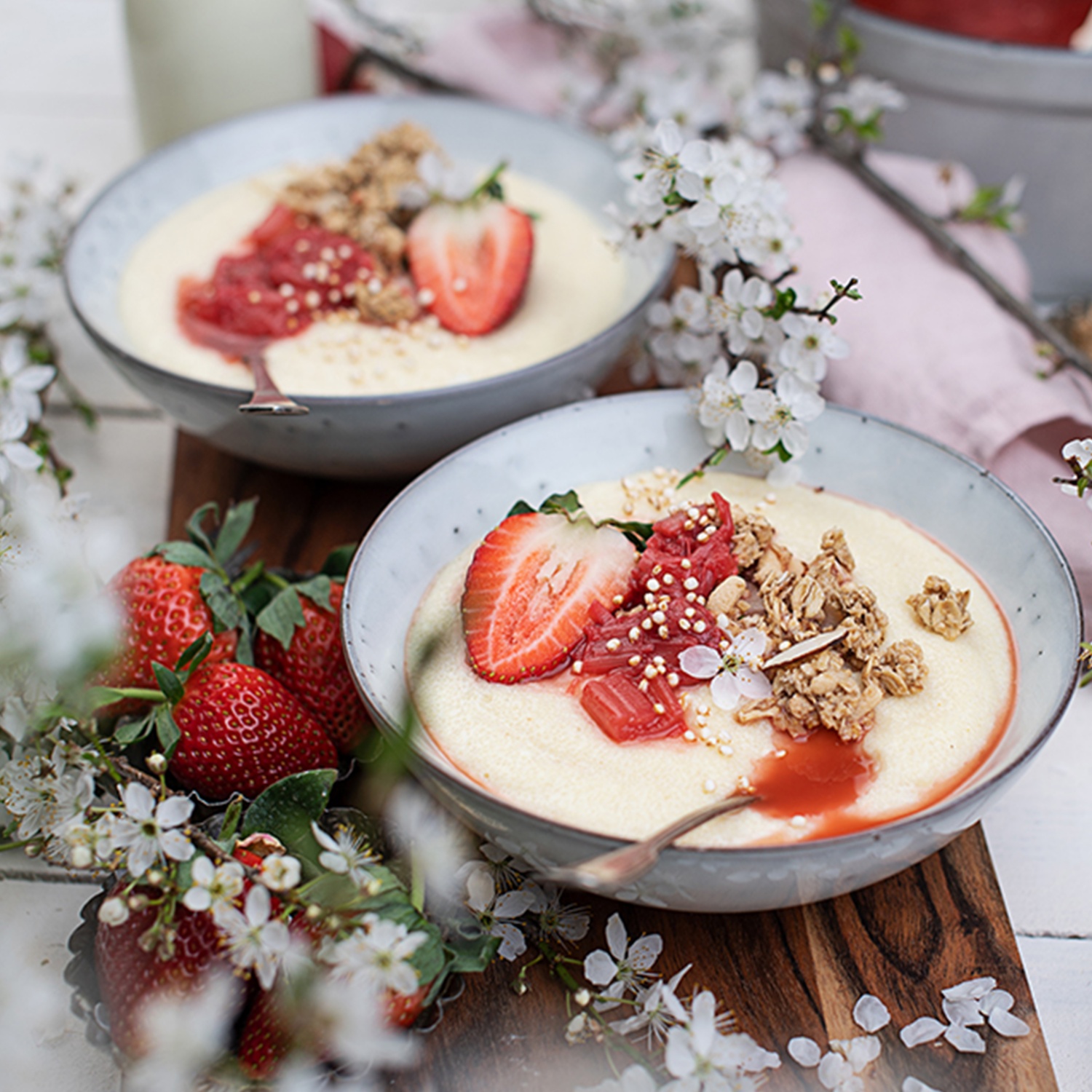 Noch warm in Schüsseln füllen, mit Rhabarber-Erdbeer-Kompott sowie Nuss-Crumble und optional mit frischen Beeren garniert servieren.