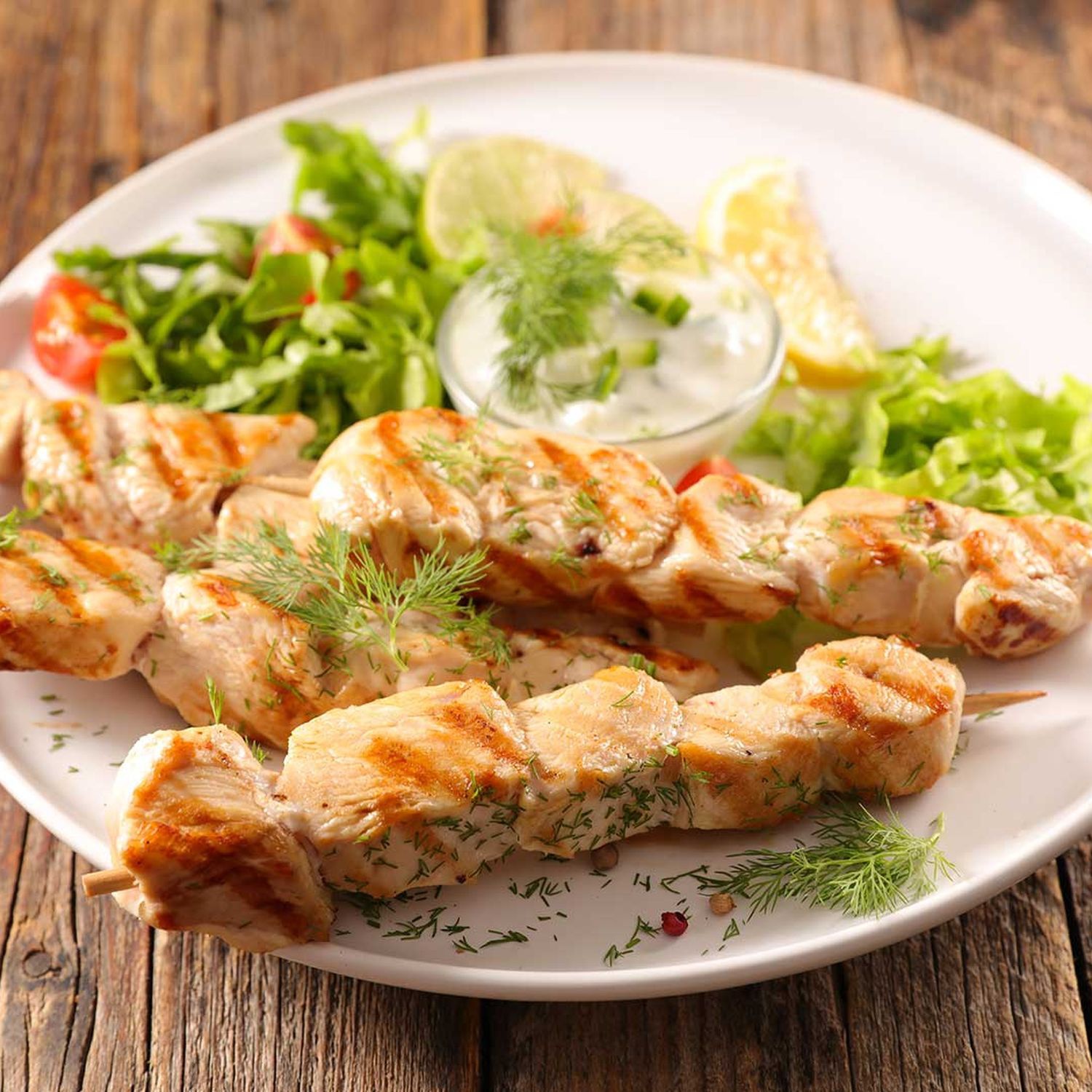 Die Grill- oder Putenspieße ca. 8 Minuten grillen, bis sie durch sind.