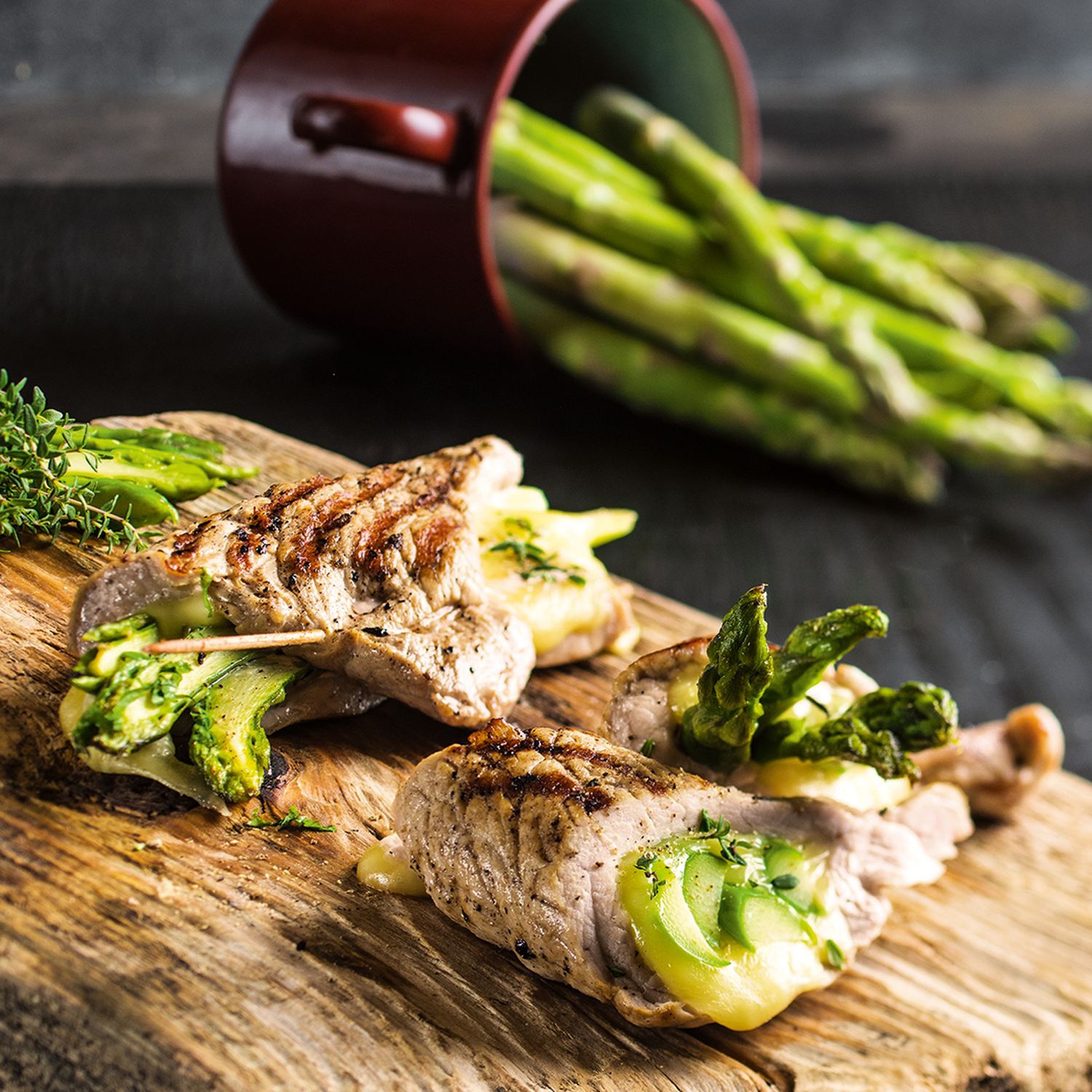 Grill-Kotelett gefüllt mit Käse und Spargel