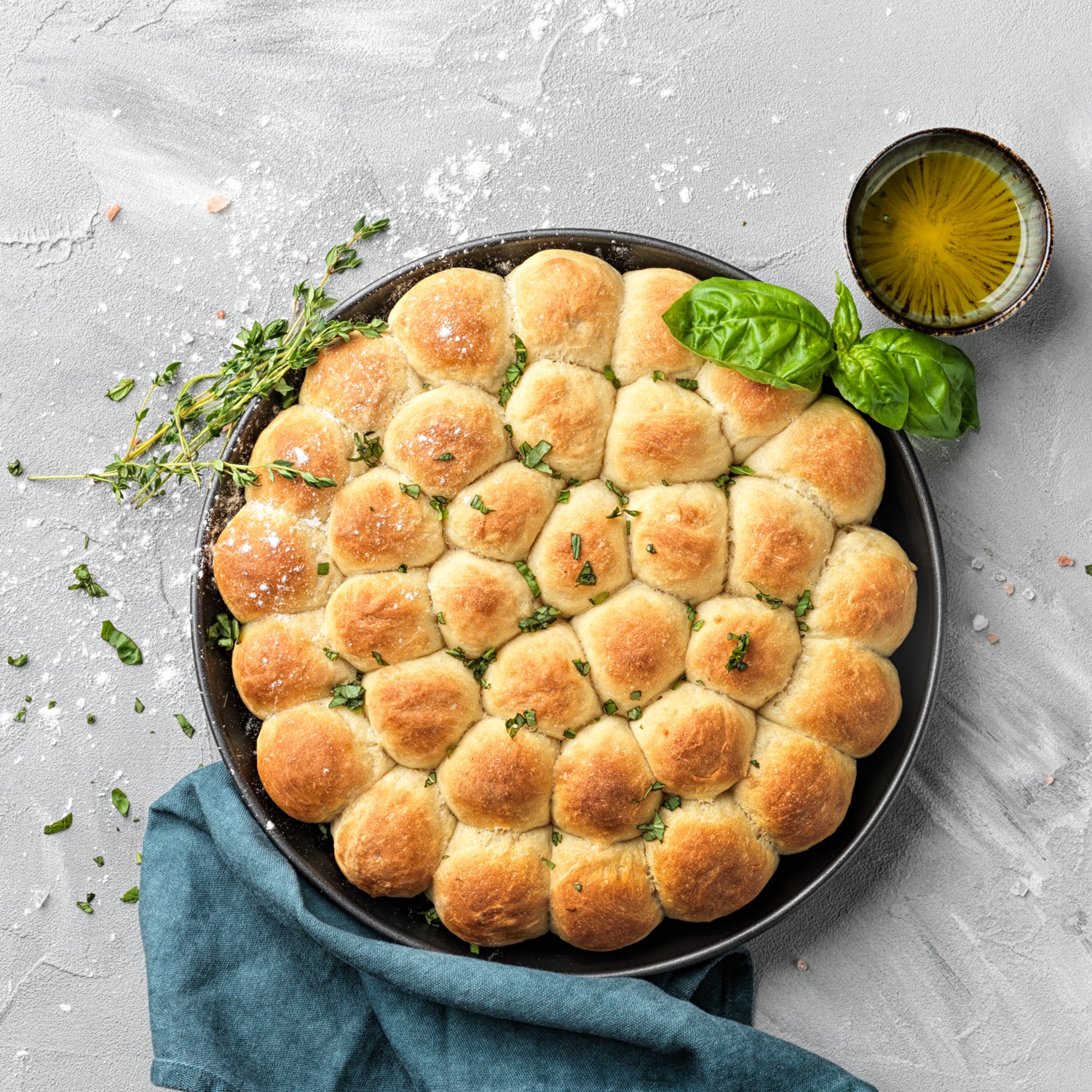 4. Den Backofen auf 200 Grad (Ober-/Unterhitze) vorheizen. Das restliche Olivenöl mit den übrigen Kräutern mischen und die Teigbällchen damit bestreichen. Ca. 15 Minuten goldbraun backen.