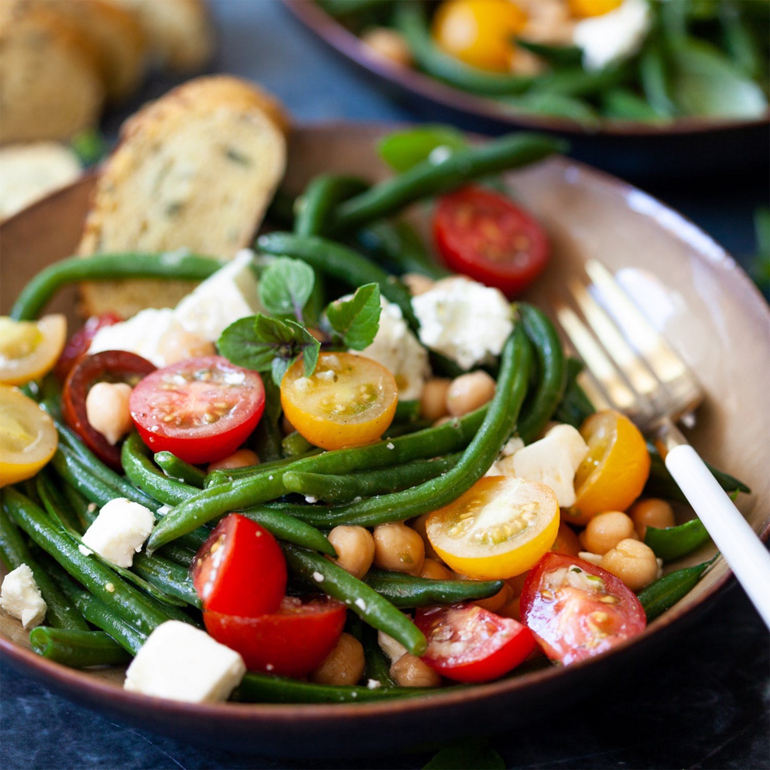 Kirschtomaten vierteln und in eine Schüssel geben. Kichererbsen waschen und abtropfen lassen. Die gekochten Bohnen sowie die Kichererbsen in die Schüssel geben und mit Dressing beträufeln. Umrühren, um alles gut zu vermischen. Abschließend Fetakäse darüber streuen.