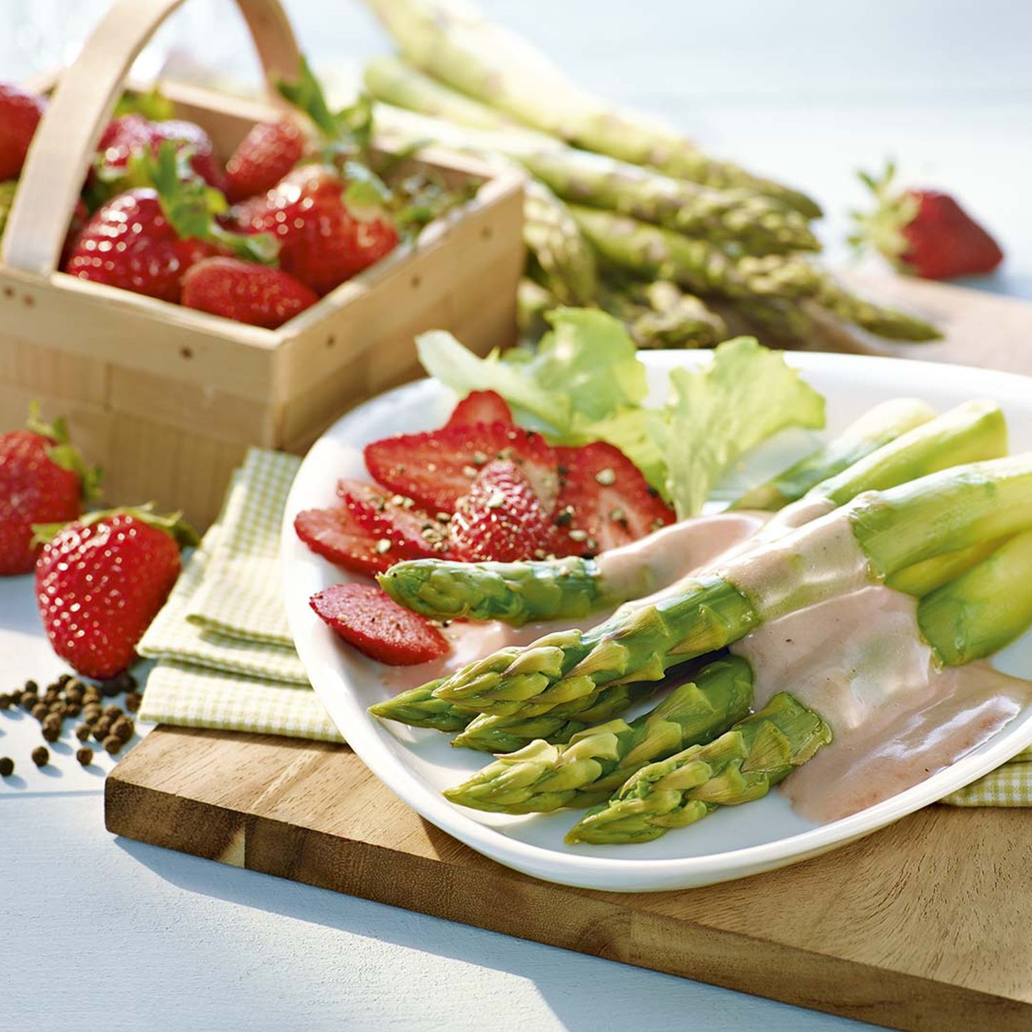 Grüner Spargel mit gepfefferten Erdbeeren und Rotwein-Mayonnaise
