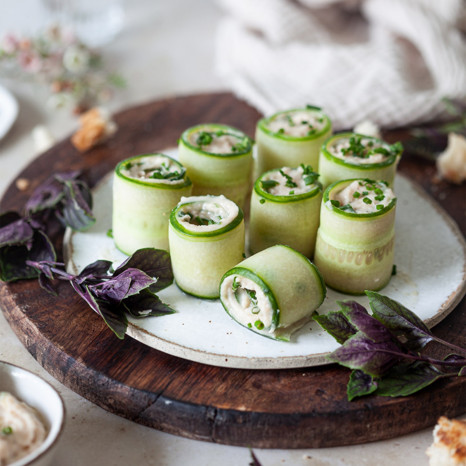 4. Einen Gurkenstreifen auf einer sauberen Fläche auslegen. Einen kleinen Löffel der Cannellini-Bohnencreme an einem Ende des Gurkenstreifens platzieren. Den Gurkenstreifen vorsichtig um die Creme rollen, um ein Röllchen zu formen. Falls nötig, das Röllchen mit einem Zahnstocher fixieren.