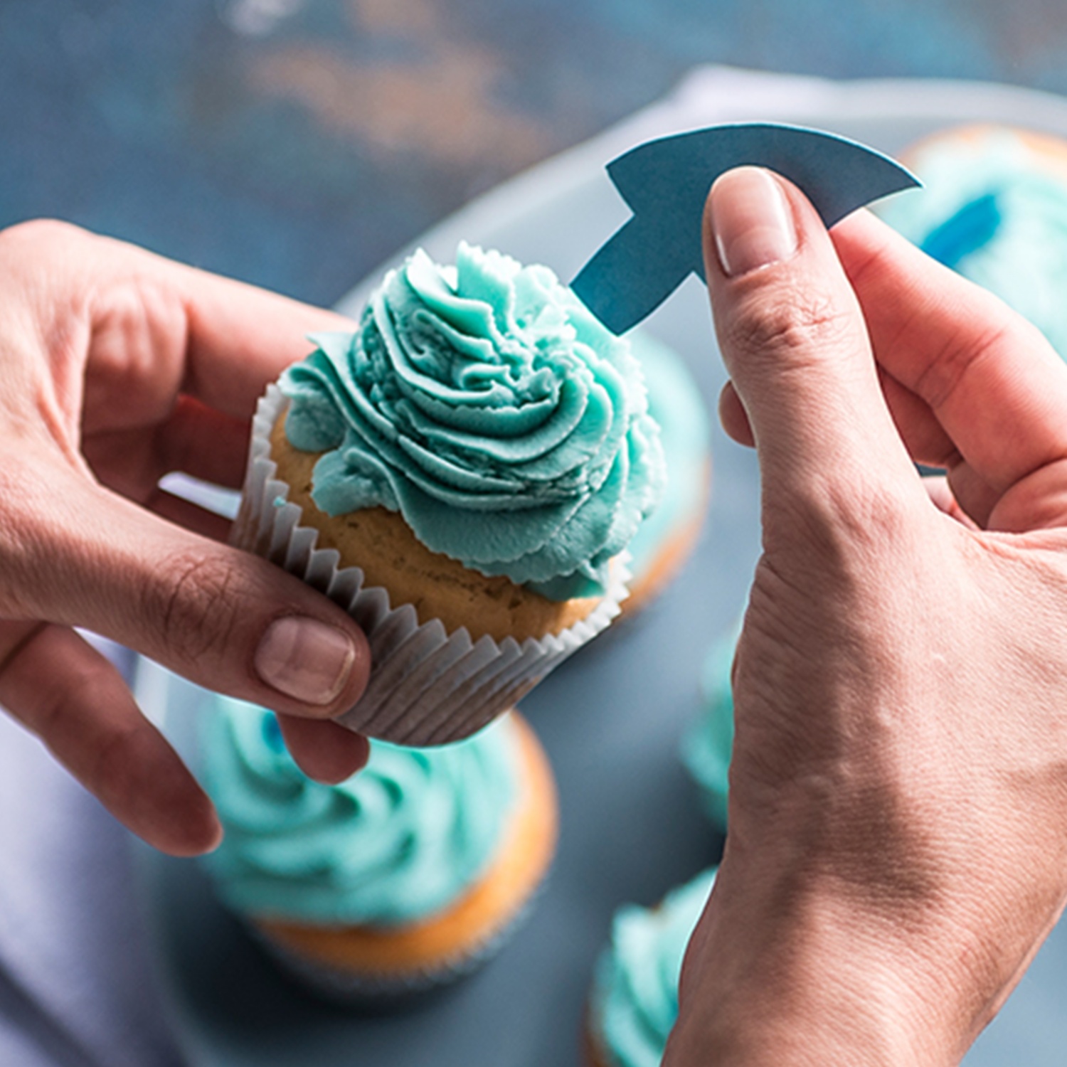 Die fertigen Muffins mit Haifischflossen dekorieren (ganz einfach aus blauem, dicken Papier ausschneiden).
