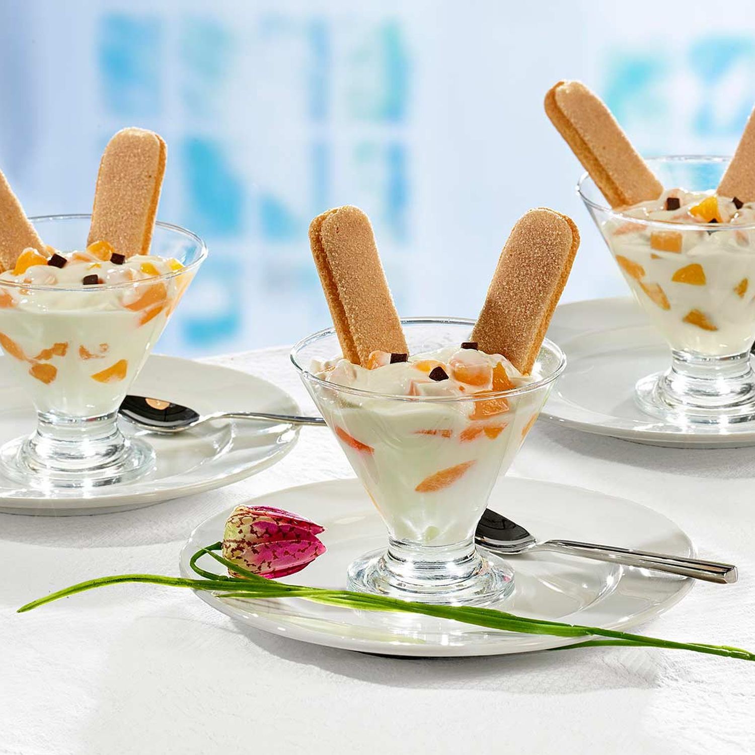 Jeweils zwei Eierbiskotten als Hasenohren in jedes Glas stecken. Wer ganz kreativ ist, kann das Dessert mit Augen und Nase aus Schokotropfen verzieren. Bis zum Servieren kühlstellen.