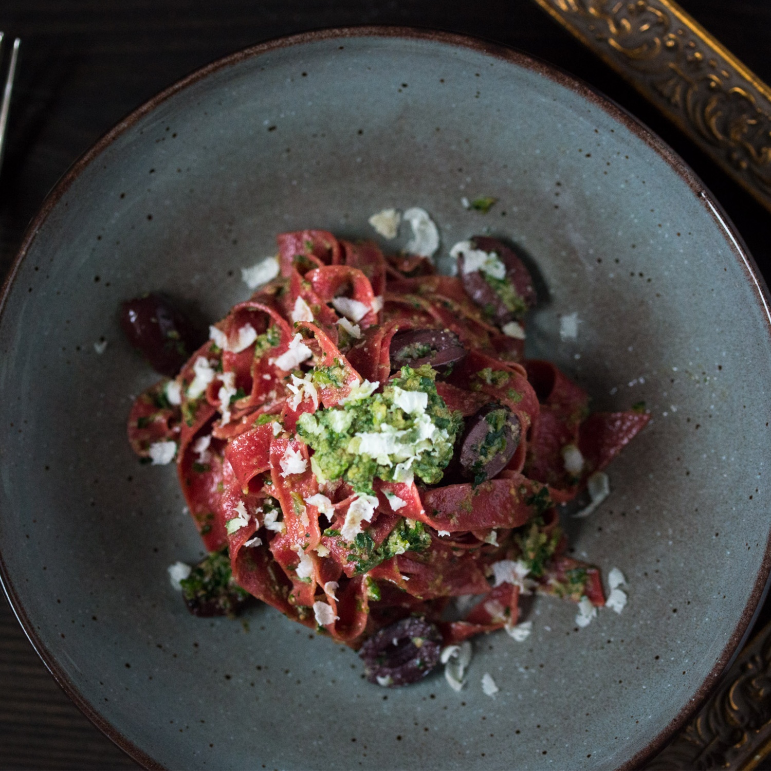 Das Mehl, den Hartweizengrieß, Salz, Ei und Eidotter, Olivenöl sowie den reduzierten Rote Rübensaft mit der Küchenmaschine oder mit der Hand zu einem kompakten, geschmeidigen und glatten Teig verarbeiten. Den Teig in Frischhaltefolie einschlagen und für mindestens 30 Minuten im Kühlschrank rasten lassen.