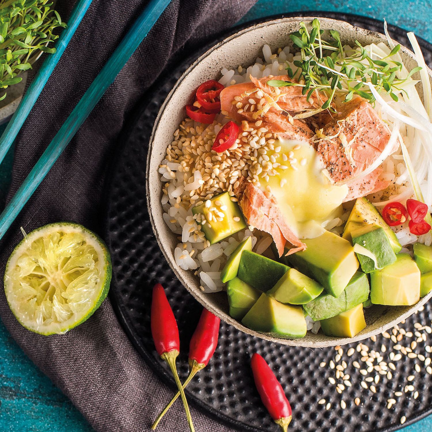Den warmen Reis in eine Schüssel füllen. Mit Lachs, Mayonnaise, Avocado und Sesam belegen und mit Kresse bestreuen.
