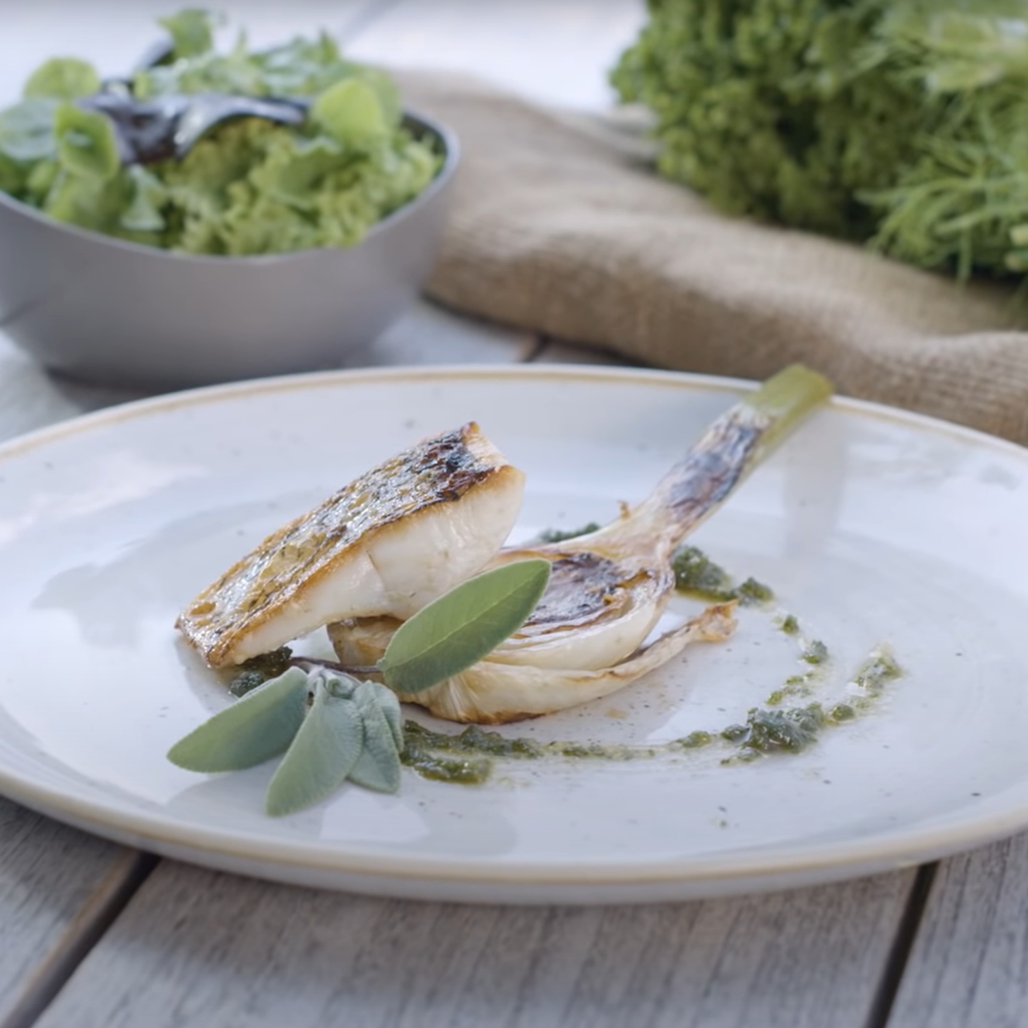 4. Salbeiblätter und Walnusskerne hacken und mit etwas Olivenöl zu einem Pesto vermischen. Etwas von dem Pesto auf dem Teller verteilen, darauf die Fischfilets und Fenchelstücke anrichten und genießen!