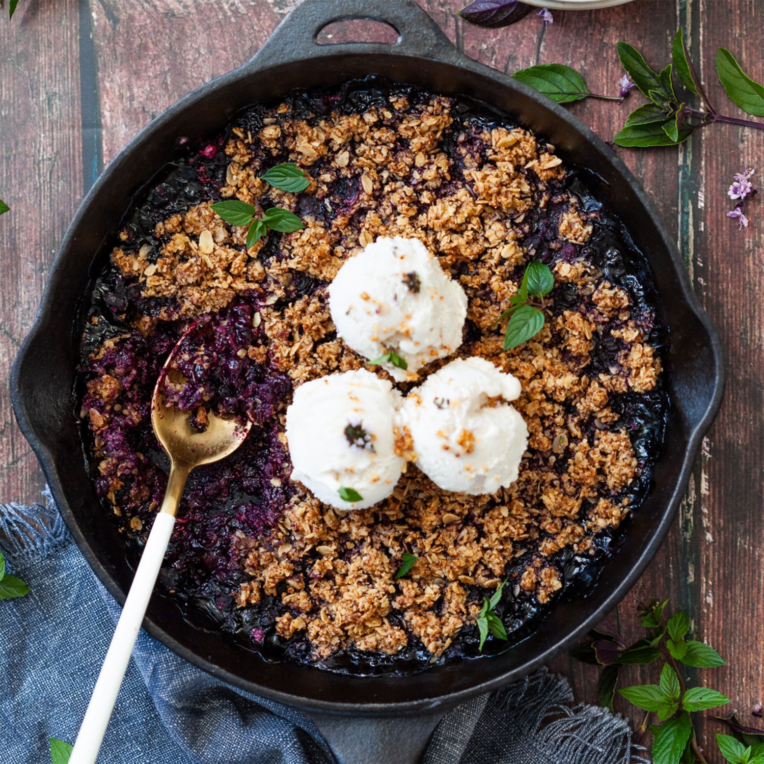 Den Crumble etwa 45 Minuten goldbraun backen. Leicht auskühlen lassen und mit einer Kugel Vanilleeis servieren.
