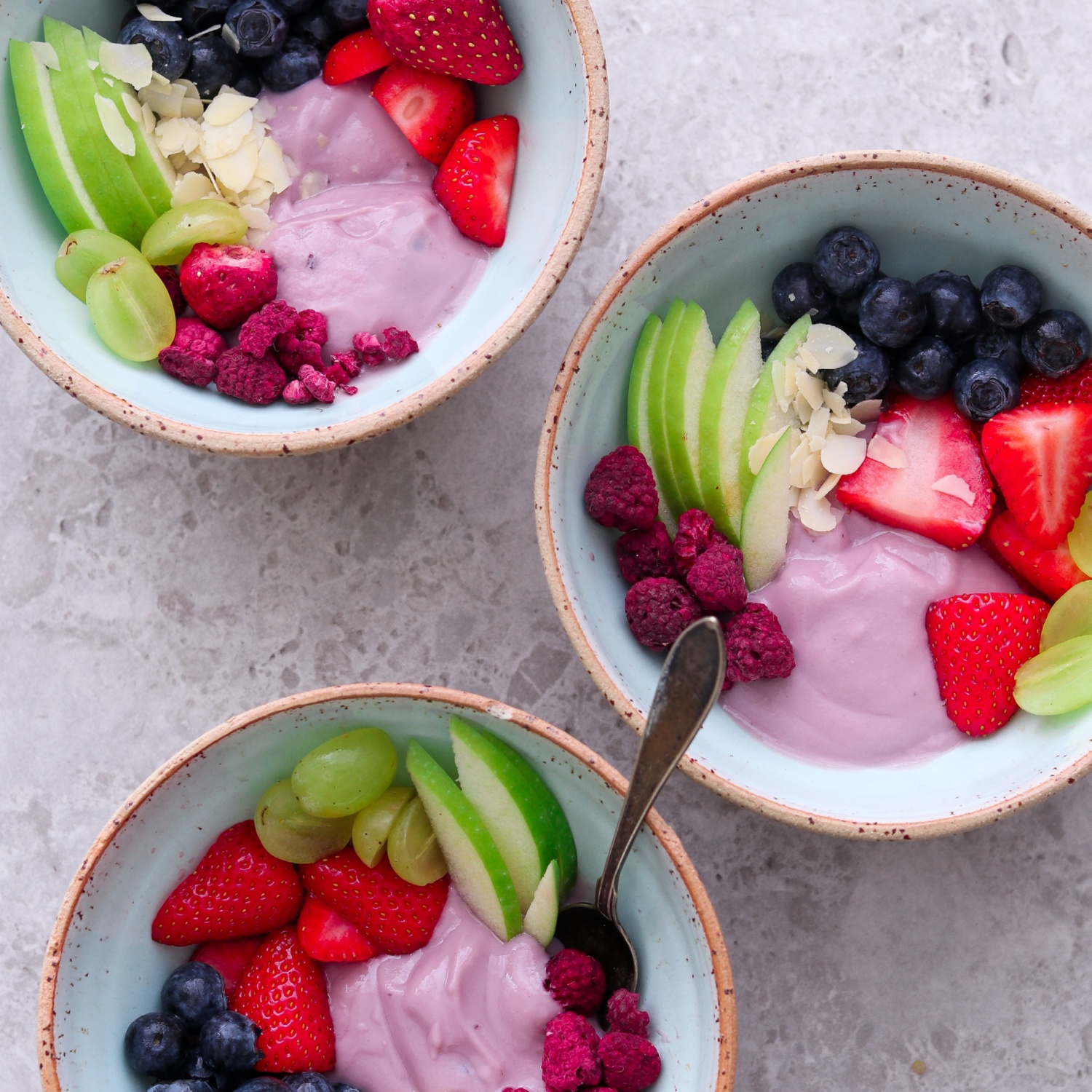Kokoscreme mit Heidelbeeren, Banane und Agavendicksaft in einem Mixer fein vermengen.