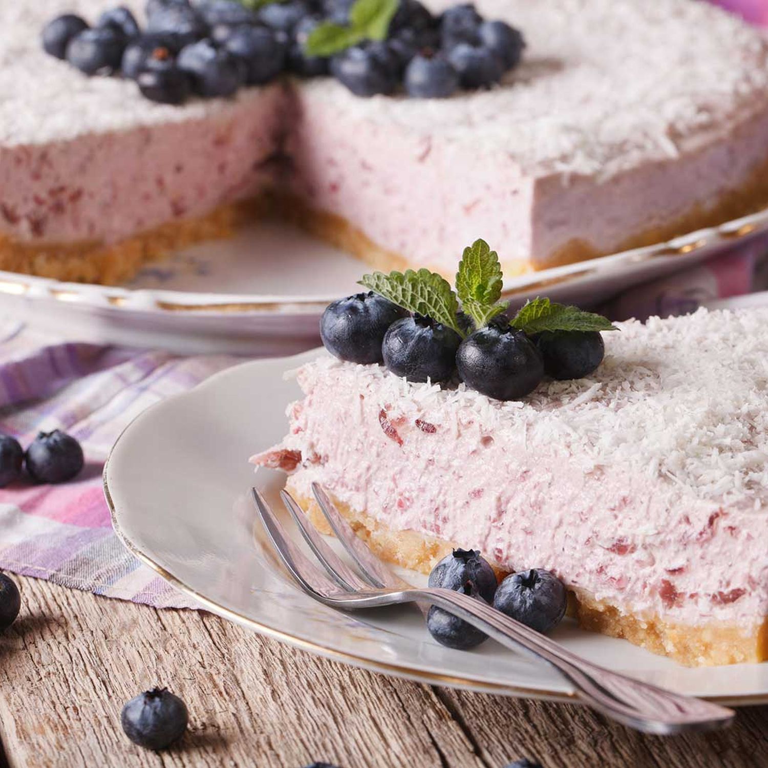 Zuerst die Heidelbeermasse auf den Boden streichen. Danach die helle Masse darauf streichen. Für mindestens 5 Stunden im Kühlschrank fest werden lassen.