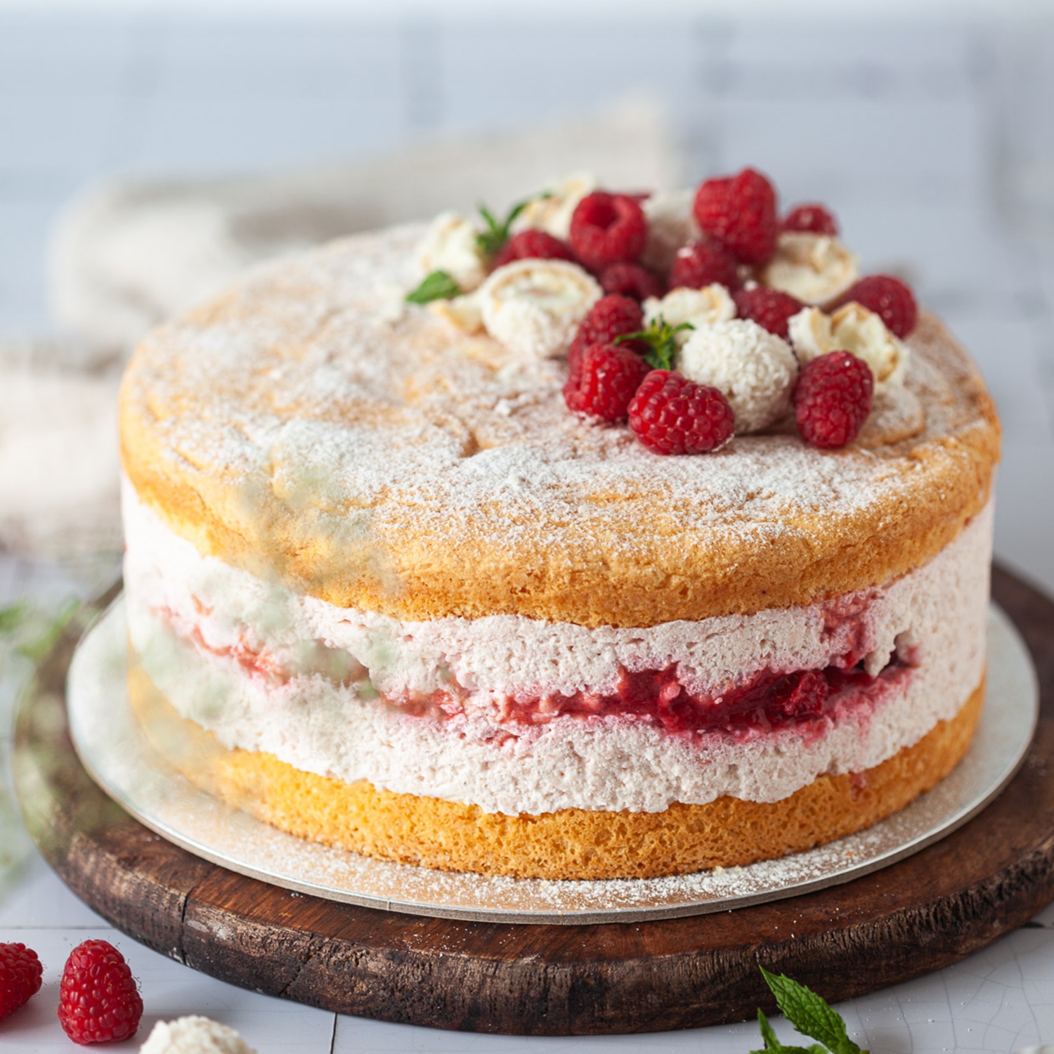 Den abgekühlten Biskuitkuchen waagerecht halbieren. Die untere Schicht auf einen Servierteller legen und einen Tortenring darum befestigen. Die Hälfte der Topfencreme auf den Tortenboden geben und glattstreichen. Das restliche Himbeerpüree darüber gießen und die restlichen Himbeeren gleichmäßig verteilen. Die restliche Creme vorsichtig auf den Himbeeren verteilen und glattstreichen. Den zweiten Biskuitboden darauflegen.