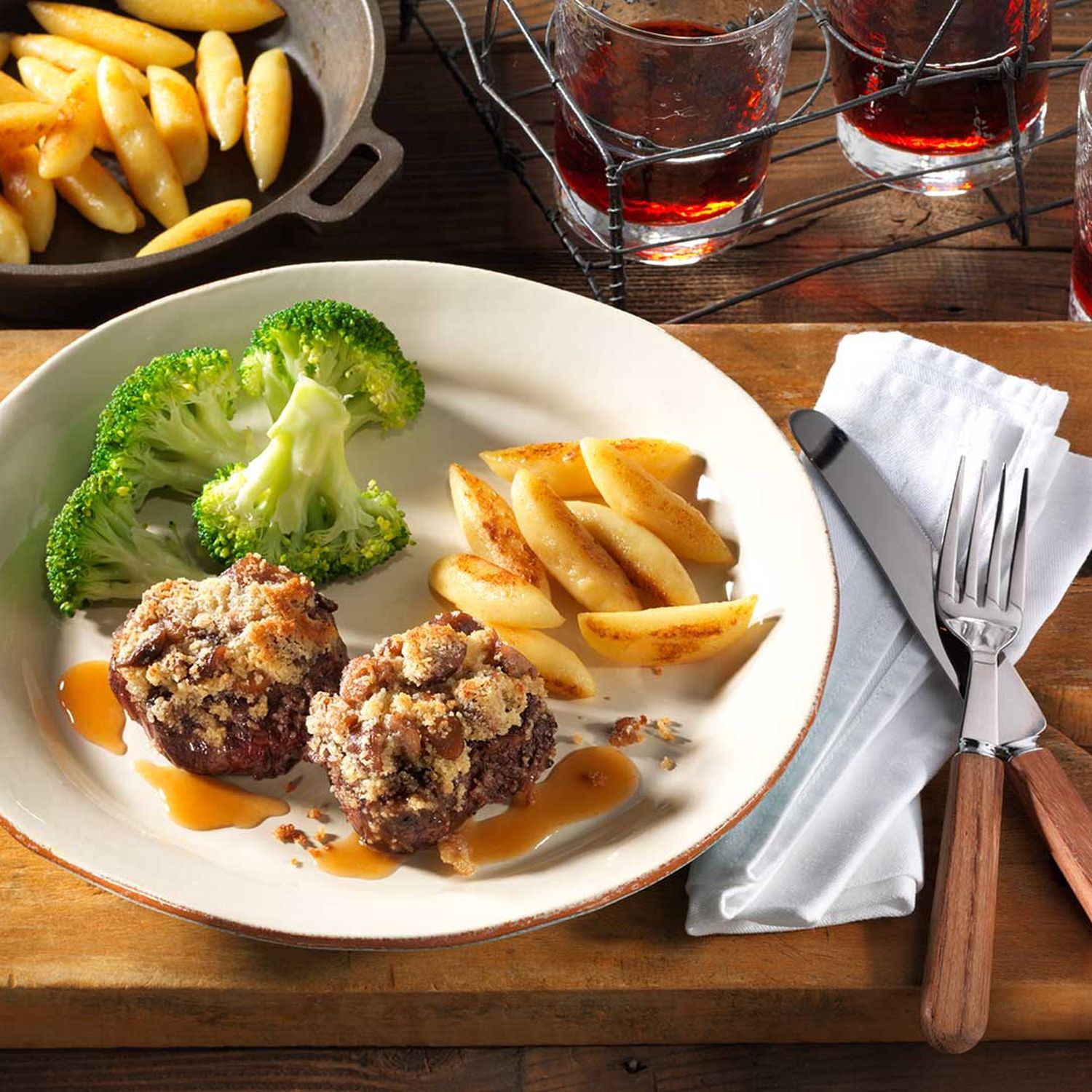 Die Medaillons aus dem Ofen nehmen und gemeinsam mit der Soße und dem Brokkoli servieren.