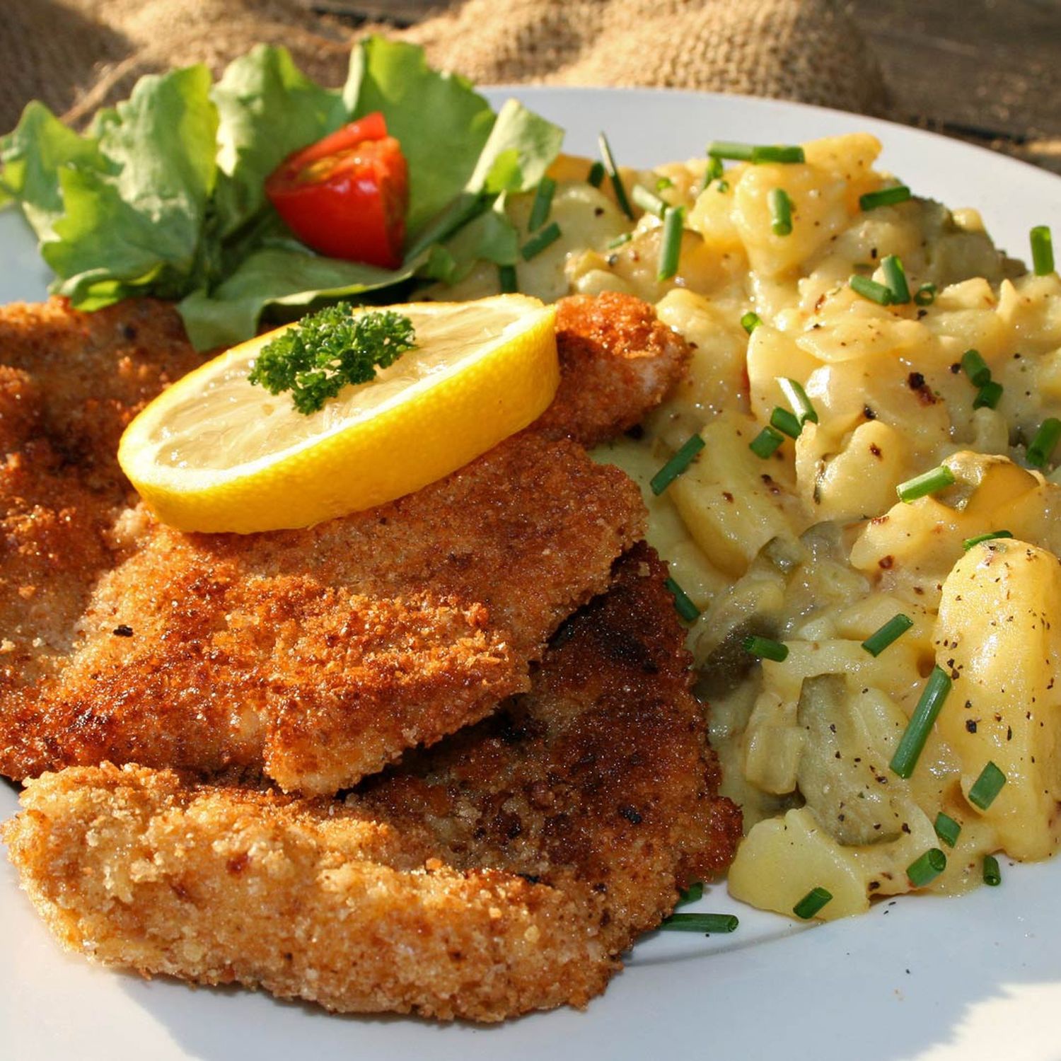Die Schnitzel mit dem Kartoffelsalat auf vorgewärmten Tellern anrichten und mit Zitronenachteln garnieren. Die Preiselbeeren dazu reichen.