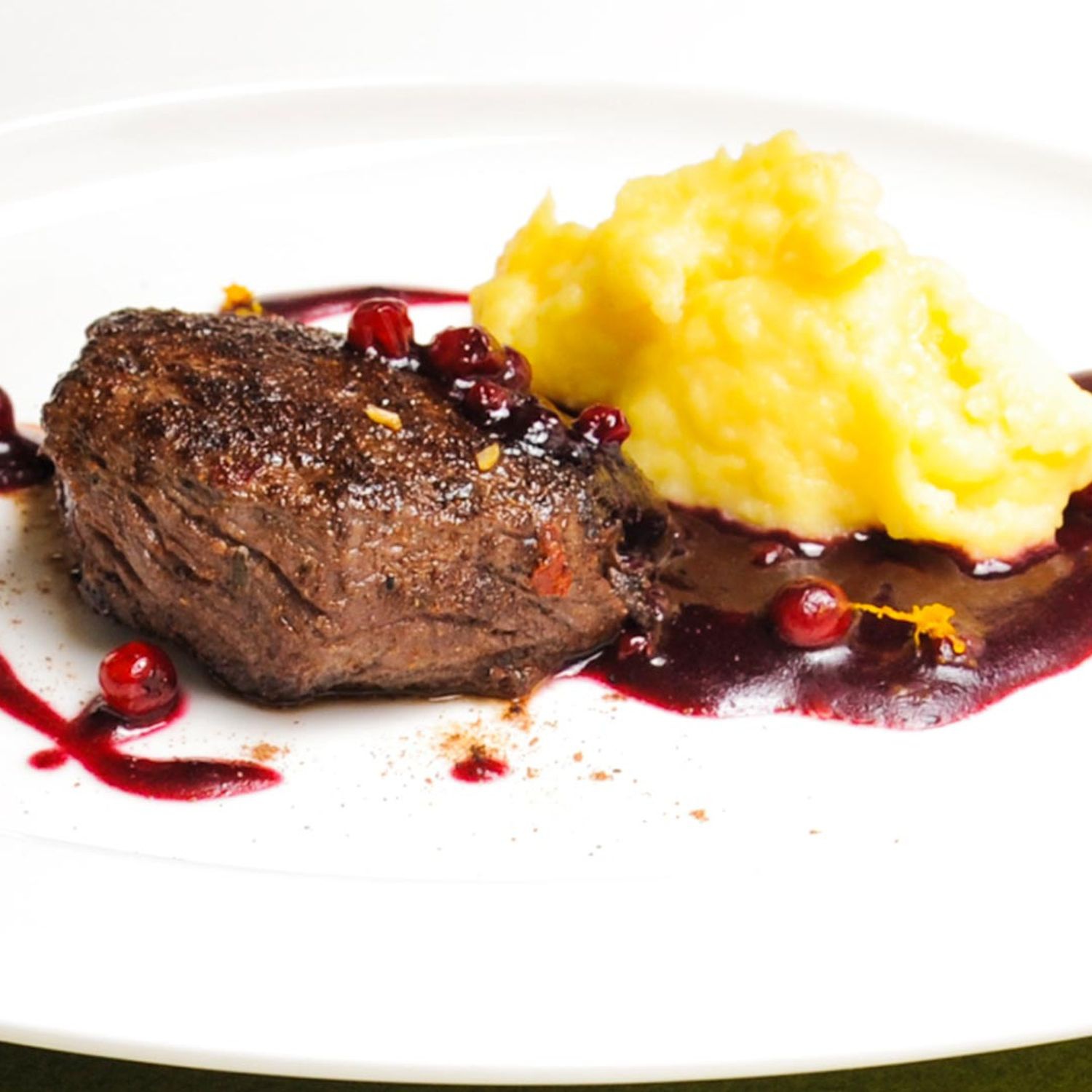 Hirschsteaks mit Bratapfel-Kartoffel-Püree und Rotweinsauce