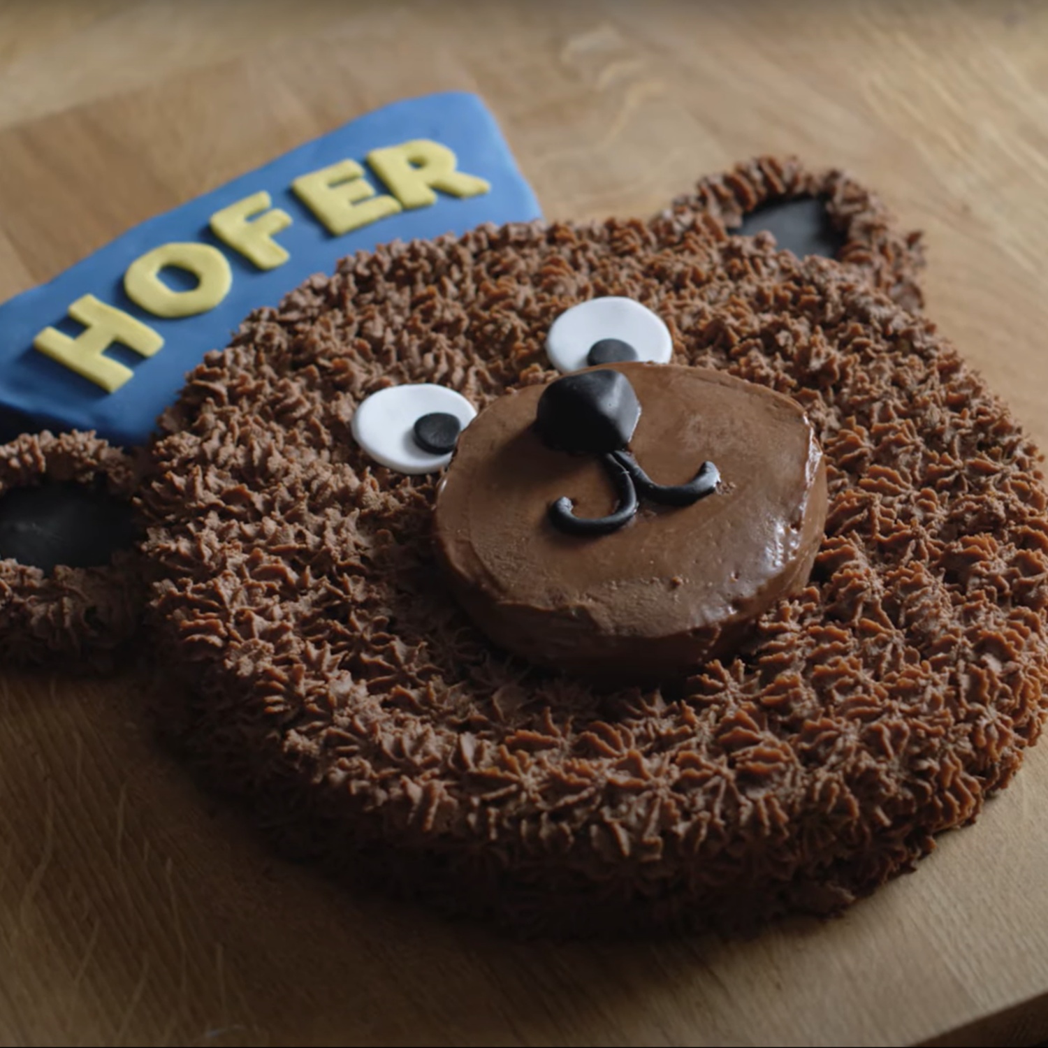 10. Die einzelnen Teile zum HOFER Bär zusammensetzen und die restliche Schokocreme mit einem Spritzbeutel auf dem großen Tortenboden, dem Gesicht des Bären, verteilen.