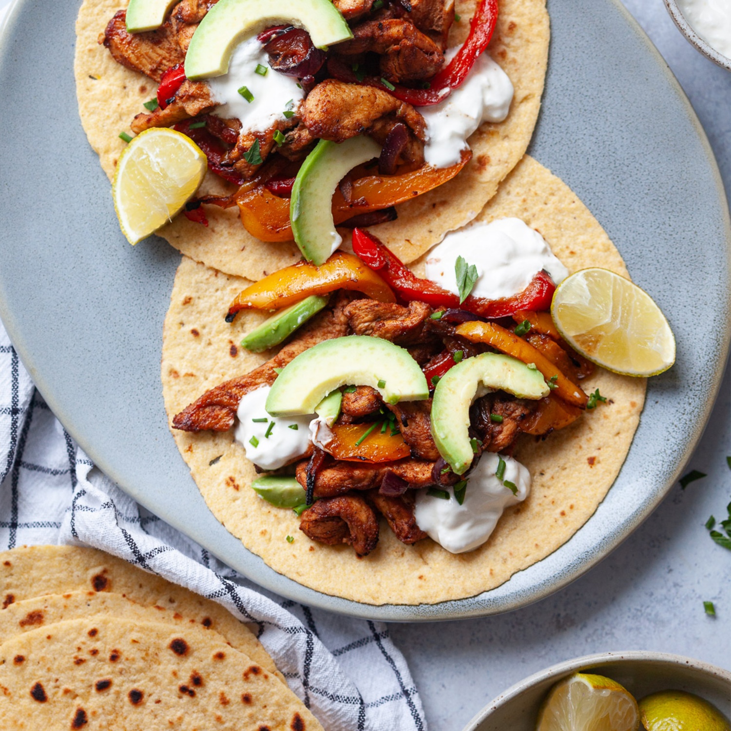 Auf jede warme Tortilla eine Portion gekochtes Hühnchen und angebratenes Gemüse geben. Mit Avocado Scheiben, etwas Sauerrahm und einem Spritzer Limettensaft garnieren.