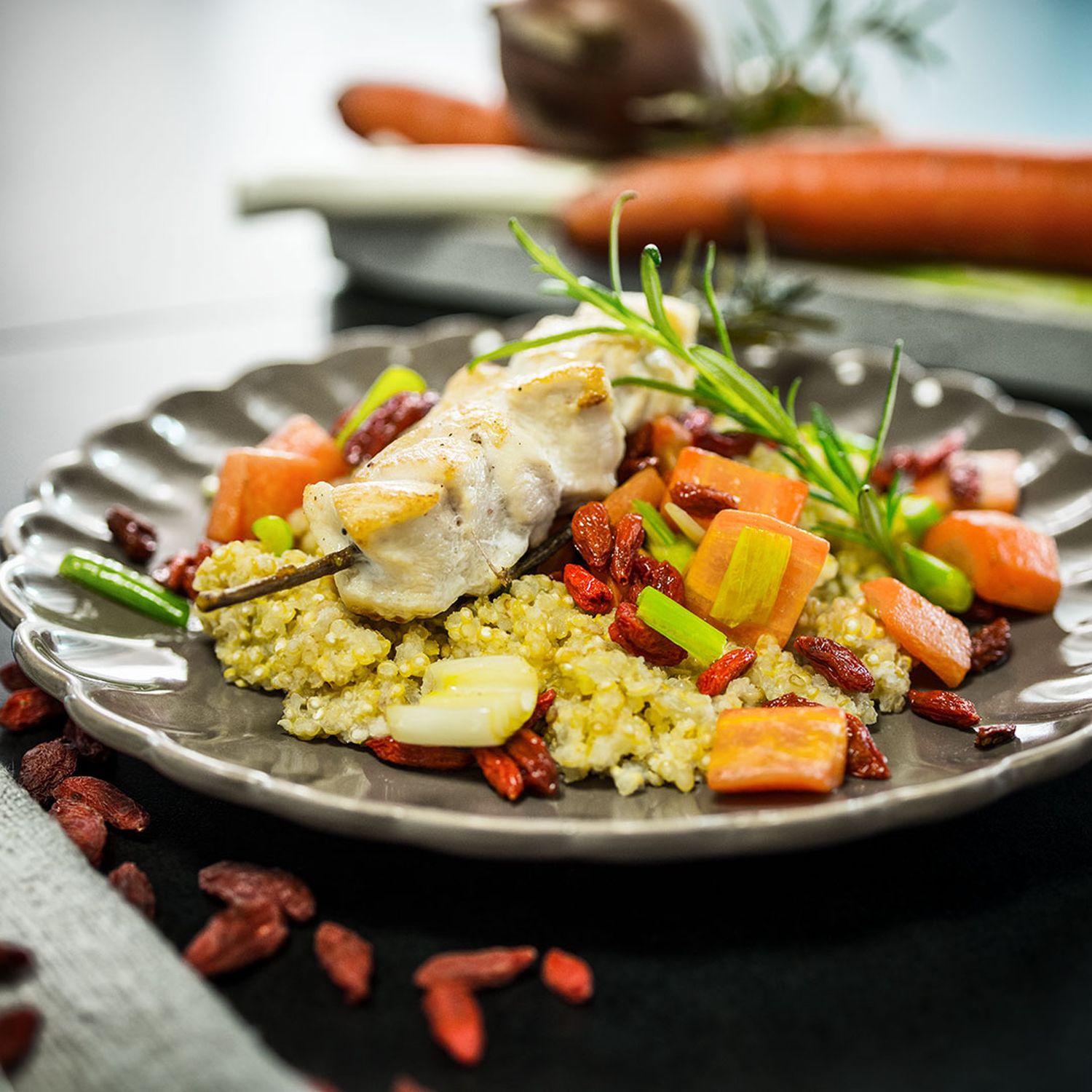 6. Pfanne mit Öl erneut auf mittlere Stufe erhitzen, Karotten ca. 5 Minuten bissfest braten, dann Jungzwiebeln ca. 2–3 Minuten mitbraten. Mit Salz und Pfeffer abschmecken, Gojibeeren hinzufügen und einmal schwenken. Mandelmilch unter das gegarte Risotto mischen, mit Salz und Pfeffer abschmecken. Die Hühnchenspieße mit Risotto und Gemüse anrichten.