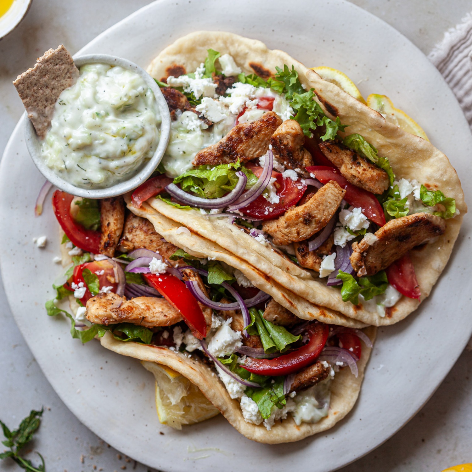 Gyros zusammenstellen: Ein Stück Fladenbrot nehmen und eine großzügige Menge Tzatziki in der Mitte verteilen. Einige Streifen des gebratenen Huhns darauflegen. Mit geschnittenen Tomaten, roten Zwiebeln, zerzupftem Salat und, wenn gewünscht, Feta-Käse garnieren. Das Fladenbrot über die Füllung klappen und sofort servieren.