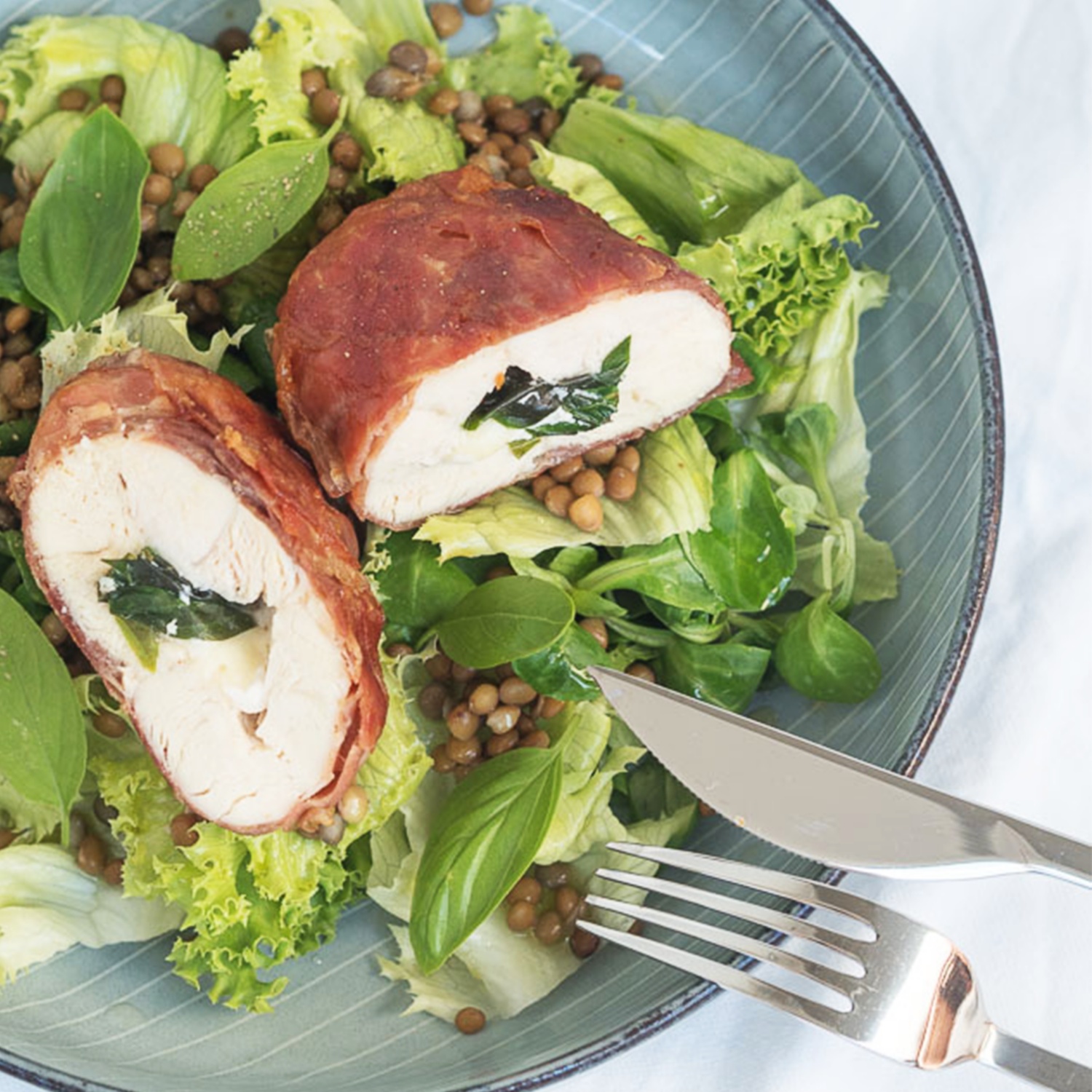 6. Ist das Hühnerfilet mit Prosciutto-Mantel fertig, sollte es noch ein paar Minuten ruhen. Dann servieren und genießen.
