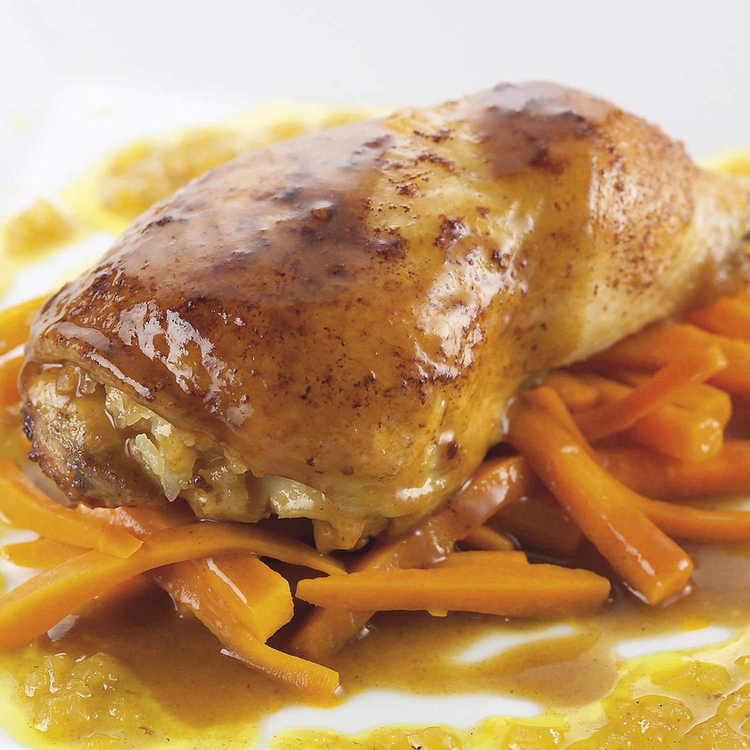 Das Fleisch aus der Pfanne nehmen, warmhalten und das Fett abschütten. Den übrigen Bratenrückstand mit braunem Geflügelfond aufgießen und stark einkochen, wenn notwendig nachwürzen. Die Karotten auf Teller aufteilen, die Hühnerkeulen darauf legen und mit Curryaroma anrichten. Erst bei Tisch den Natursaft über das Fleisch nappieren.