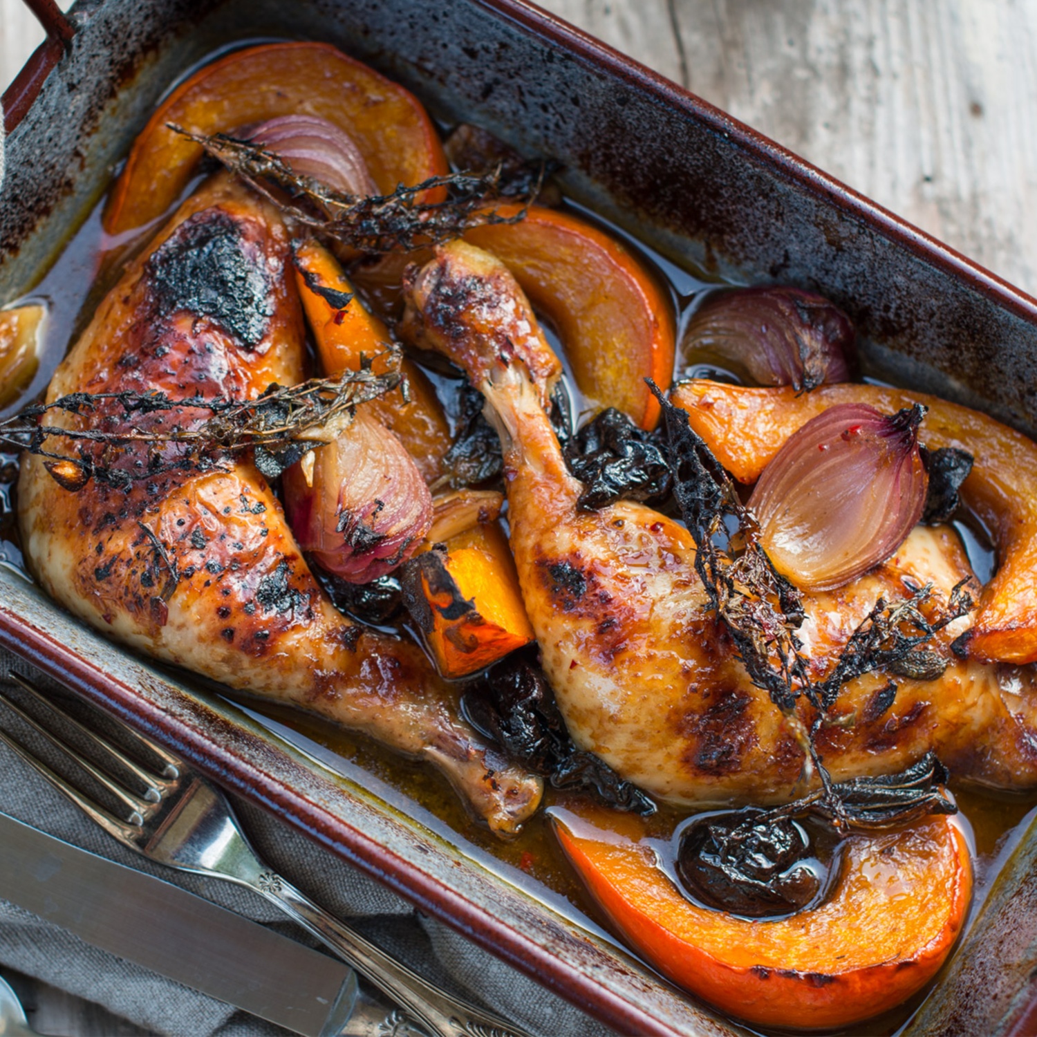 Hühnerkeulen mit Kürbis-Ofenpfanne