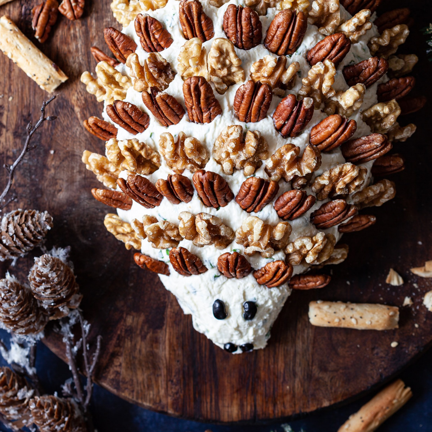 Für die Igelstacheln, vor dem Servieren die Igelformen mit Pekan- und Wallnusskernen dekorieren und die schwarzen Bohnen für die Augen und Nase des Igels verwenden.