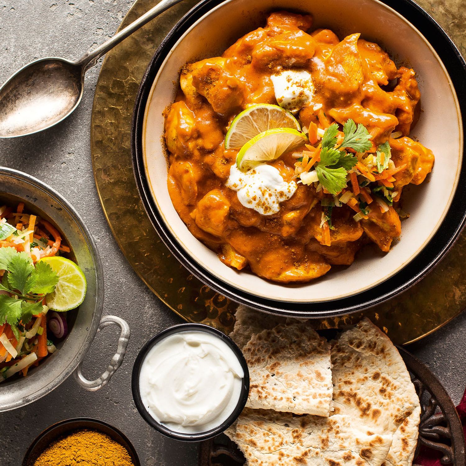 Etwas Pflanzenöl in einer Pfanne erwärmen und das Hühnerfleisch anbraten. Mit der Tandoori Indische Sauce auffüllen und langsam für ca. 7 Min. köcheln lassen. Mit dem Joghurt verfeinern. Das Naan Brot für ca. 4 Min. backen.