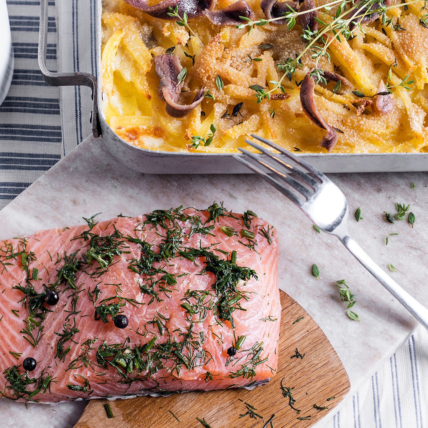 Zaubern Sie Ihren Liebsten ein leckeres Fischgericht. Mit der Schritt-für-Schritt-Anleitung können Sie die Janssons Frestelse mit selbstgebeiztem Lachs ganz einfach nachkochen.