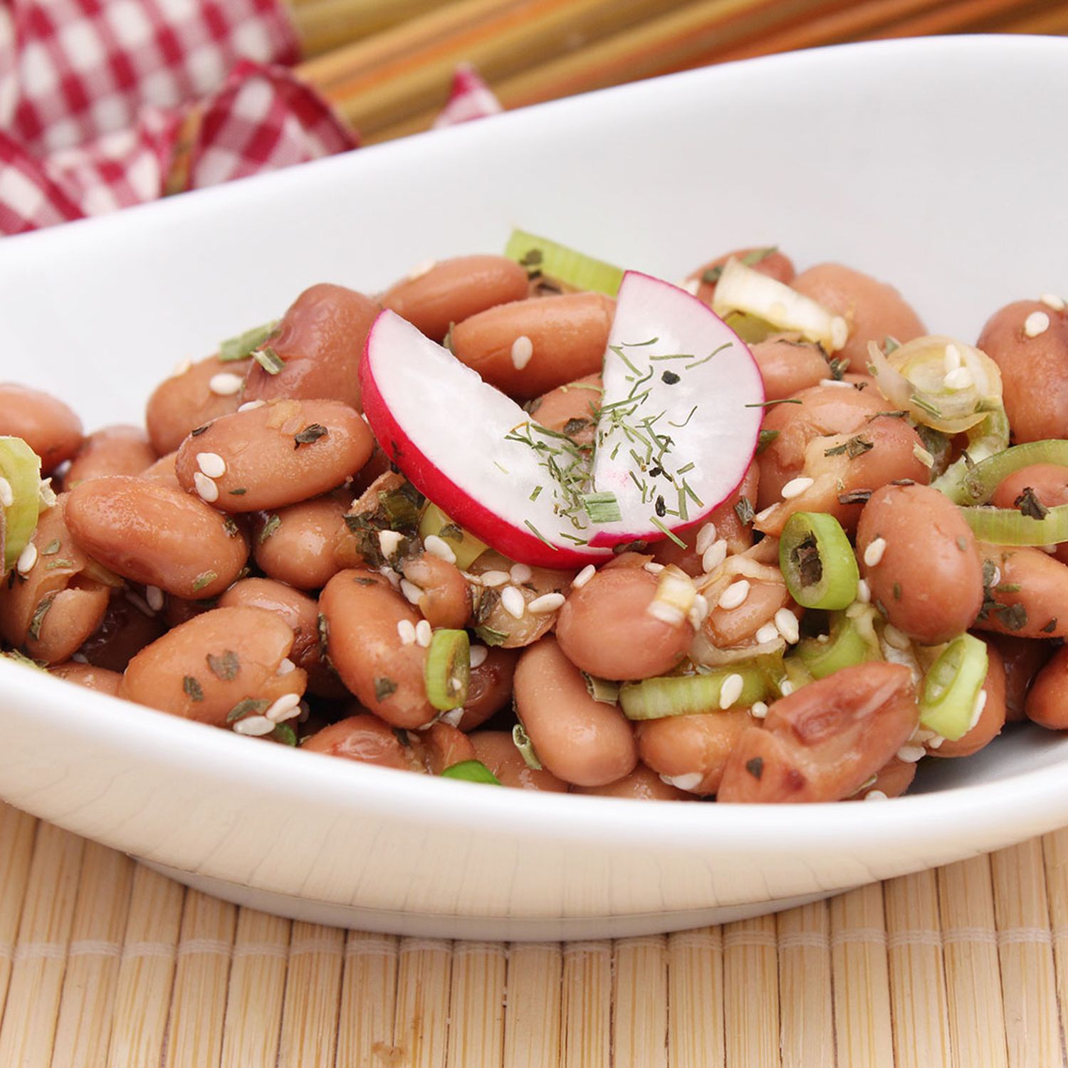 Die Käferbohnen in einem Sieb abwaschen und in eine Schüssel füllen. Zwiebel und Radieschen darüber streuen, mit Essig und Kürbiskernöl abmachen.