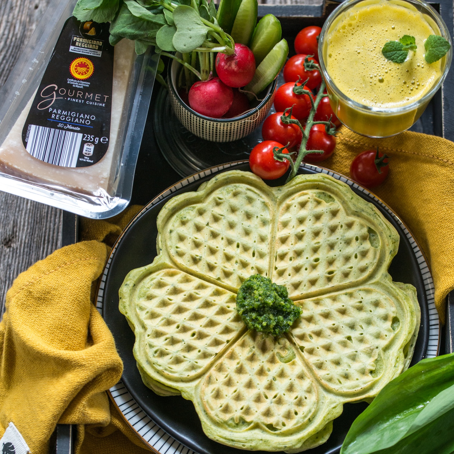 Gemüsegarnitur putzen, waschen und gemeinsam mit den Waffeln mit frisch gepresstem Saft anrichten.