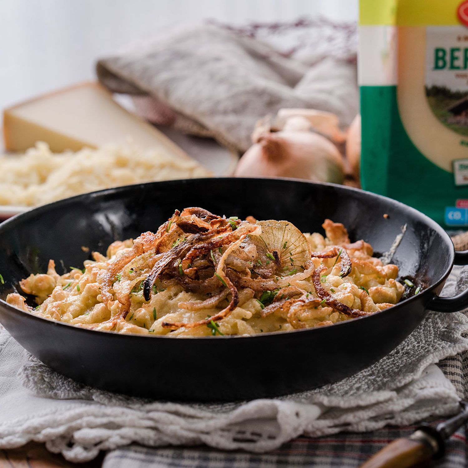 Spätzle in eine Pfanne mit etwas Butter geben. Den geriebenen Käse auf den Spätzle verteilen. So lange erhitzen, bis der Käse geschmolzen ist. Umrühren.